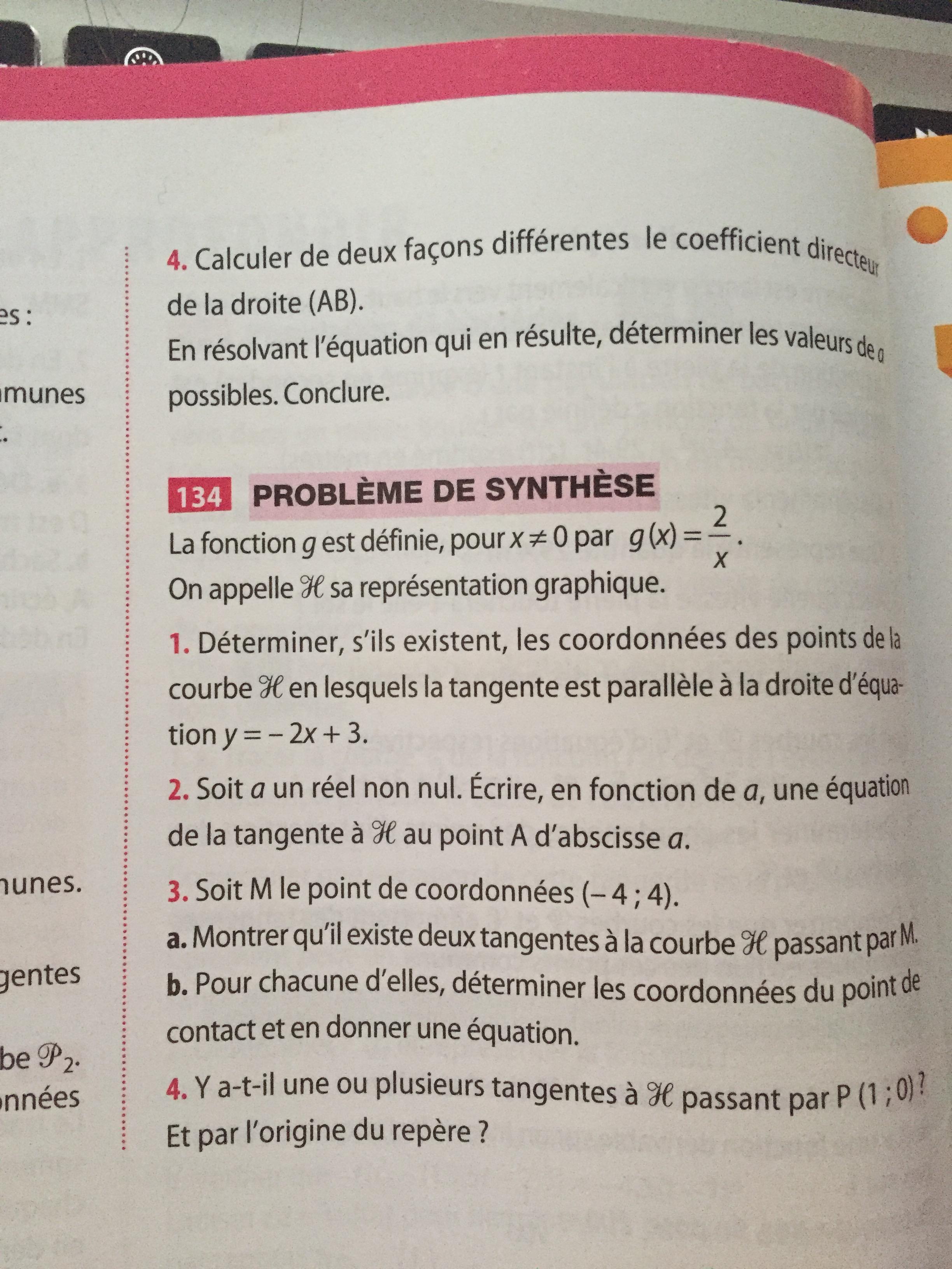 E-Bahut PAVE Posté(e) le 3 janvier 2019 E-Bahut Signaler Posté(e) le 3 janvier 2019 1) Bon tes réponses me rassurent : tu as compris le principe..... les conditions imposées par l'énoncé se traduisent par une équation ; le nombre de solutions de cette équation, donne le nombre de points cherchés (les solution sont les abscisses de ces points). 2) Citation pour la question 4b) j'ai fait le calcule est j'ai trouvé x=0 cela est FAUX Équation de la tangente au point d’abscisse a : y = (-2/a²) x + 4/a Pour que la tangente passe par le point O(0;0), il faudrait que son ordonnée à l'origine qui est b = 4/a soit nulle. Or 4/a ne peut pas être égal à 0 (l'équation 4/a = 0 équivaut à 4= 0*a ; quelle que soi la valeur de a , 0*a = 0 et ne peut donc pas être égal à 4 !! l'équation n' a pas de solution) Nb : si tu dis la tangente passe par le point O(0;0) équivaut à 0 = (-2/a²)(0) +4/a soit 0 = 0+4/a d'où 0 = 4/a... comme ci dessus ! Quelle que soit la valeur de a, l'égalité n'est pas possible ; cette "équation" n'a pas de solution. 3) Question 3b) Tu as trouvé les 2 points de tangence et on te demande les équations des droites tangentes en ces points tout simplement. Tu sais ce qu'est l'équation d'une droite....