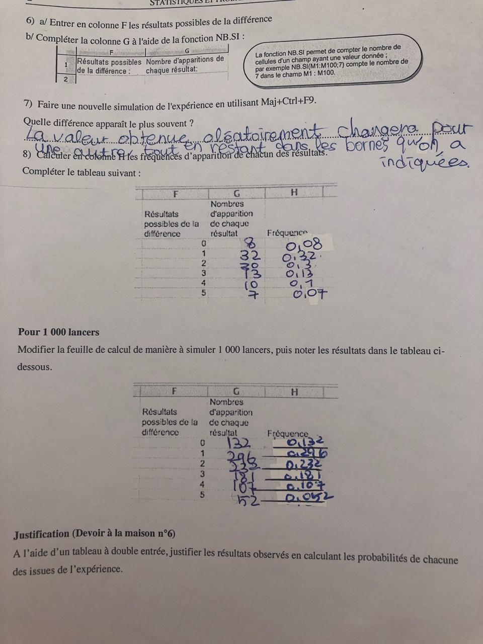 E-Bahut PAVE Posté(e) le 15 décembre 2018 E-Bahut Signaler Posté(e) le 15 décembre 2018 Je suppose que tu as déjà travaillé avec un tableur. A la question 2, on met en place une formule sûrement nouvelle pour toi. Tu peux la recopier lettre à lettre et voir le résultat que renvoie cette formule.Si tu es un peu plus familiarisée avec le tableur (lequel utilises tu ?), dès que tu saisis le début de la formule alea...le logiciel te propose la suite (double clic pour choisir et valider) et dans une bulle on te dit à quoi sert la fonction ! Donc quand ta formule est en place (elle te donne un nombre comme résultat), tu peux demander une nouvelle "activation" de cette formule en tapant au clavier ce que l'on te dit :CTRL+MAJ +F9 (avec mon tableur, il me suffit de taper F9 !!) . Dans la cellule apparaît un nouveau nombre... Et à chaque fois que je fais F9 (touche de fonction en haut du clavier) la valeur dans la cellule B2 change.... Fais une dizaine d'essais avec F9 (ou plus si tu veux...) et note les valeurs qui apparaissent successivement ; que remarques tu ? Vois tu à quoi sert cette fonction ALEA.ENTRE.BORNES (1;6) ? tu peux aller consulter l'aide fournie avec ton tableur.... A toi de faire et de dire (pense bien à chaque modification de ton fichier à l'enregistrer et à nous l'envoyer en pièce jointe...)