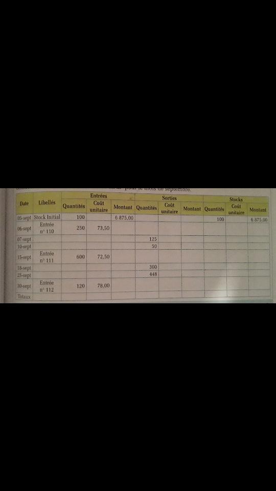 bubule66 Posté(e) le 14 janvier 2019 Signaler Posté(e) le 14 janvier 2019 Bonjour , j’aurai besoin d'aide j'ai des difficultés à réaliser cette exercice pourriez-vous m'aidez L'entreprise "Cuir et Nous" fabrique des lacets et lanières de cuir rond . Elle vous communique les données relatives aux stocks de cuir m2 pour le mois de septembre . 1/Evaluez le montant des sorties de stock à la date du 30 septembre selon du CMP (mensuel). 2/L'entreprise a -t-elle réalisé un déstockage au mois de septembre ? 3/ Cette technique d'évaluation des stocks est-elle transposable dans toutes les entreprises ? voici le tableau ci joint