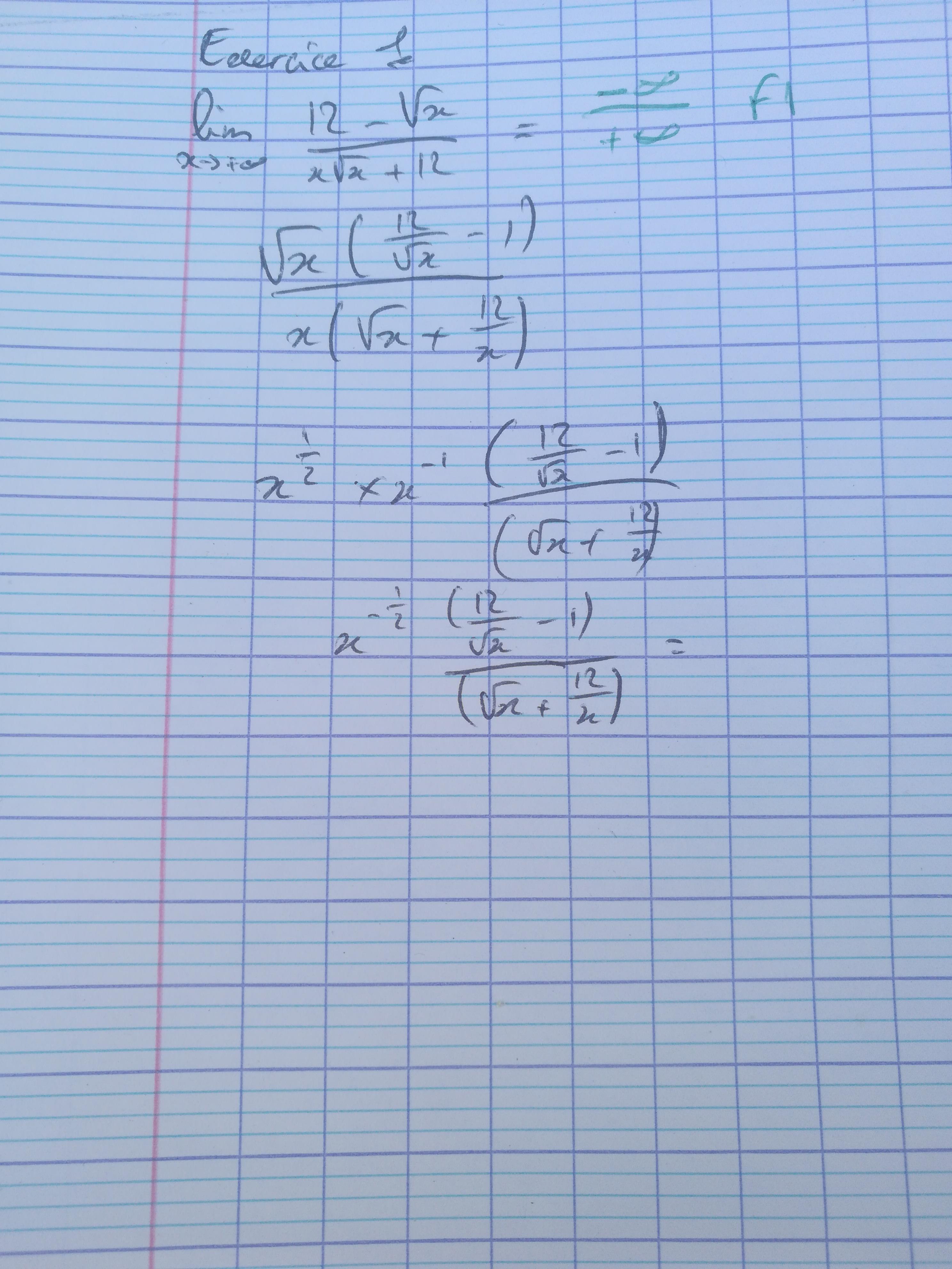 E-Bahut Barbidoux Posté(e) le 28 février 2019 E-Bahut Signaler Posté(e) le 28 février 2019 Exo 1 ——————————— a)————— x-> ∞ alors √x>>12 et x*√x>>12 lim (12-√x)/(x*√x+12) =lim -√x/(x*√x)=-1/√x=0 b)————— x-> -∞ alors √(9*x^2+1)-3*x >0 et -> ∞ lim (1/(√(9*x^2+1)+3*x )=lim (√(9*x^2+1)-3*x )/((√(9*x^2+1)+3*x )*(√(9*x^2+1)+3*x ))=lim (√(9*x^2+1)-3*x )/1= ∞ c)————— x-> 2- lim(x+2)/(3*(x-2))=0/(2*(-4)=0 d)————— x->∞ exp(-x)->0 et exp(x)->∞ lim(exp(x)+1)/(exp(-x)+1)=∞(0+1)=∞ e)————— x->∞ exp(x)>>1 lim (x+1)/exp(x)=lim x/exp(x) =0 croissances comparées de x et exp(x) f)————— x->∞ sin(x) appartient à [-1,1] et √x->∞ ==> lim 5-sin(x)/√x =5