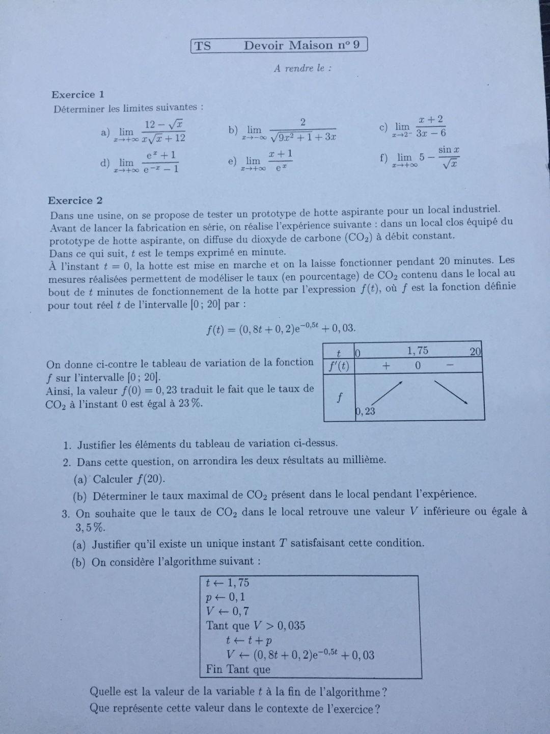 E-Bahut julesx Posté(e) le 28 février 2019 E-Bahut Signaler Posté(e) le 28 février 2019 Juste un petit retour sur l'exercice 1 : Ton idée était bonne, mais il y a une erreur dès le début. (12-√x)*(x√x+12) = √x(12/√x-1)/[x√x(1+12/(x√x))] = (12/√x-1)/[x(1+12/(x√x))] x->∞ => 12/√x-1->-1 1+12/(x√x)->1 donc il reste -1/x qui tend vers 0. Exercice 2 1) Il faut calculer la dérivée f'(t) et chercher son signe sur [0;20]. Tu verras en particulier que f'(t)=0 pour t=1,75. 2)a) et b) Ce sont des calculs, je te laisse les faire. 3)a) Utilise le corollaire du TVI sur l'intervalle [1,75;20]. b) Je te laisse faire tourner l'algorithme pour trouver la valeur de t. Cette valeur représente le temps en minutes au bout duquel le taux de CO2 devient inférieur à 3,5%.