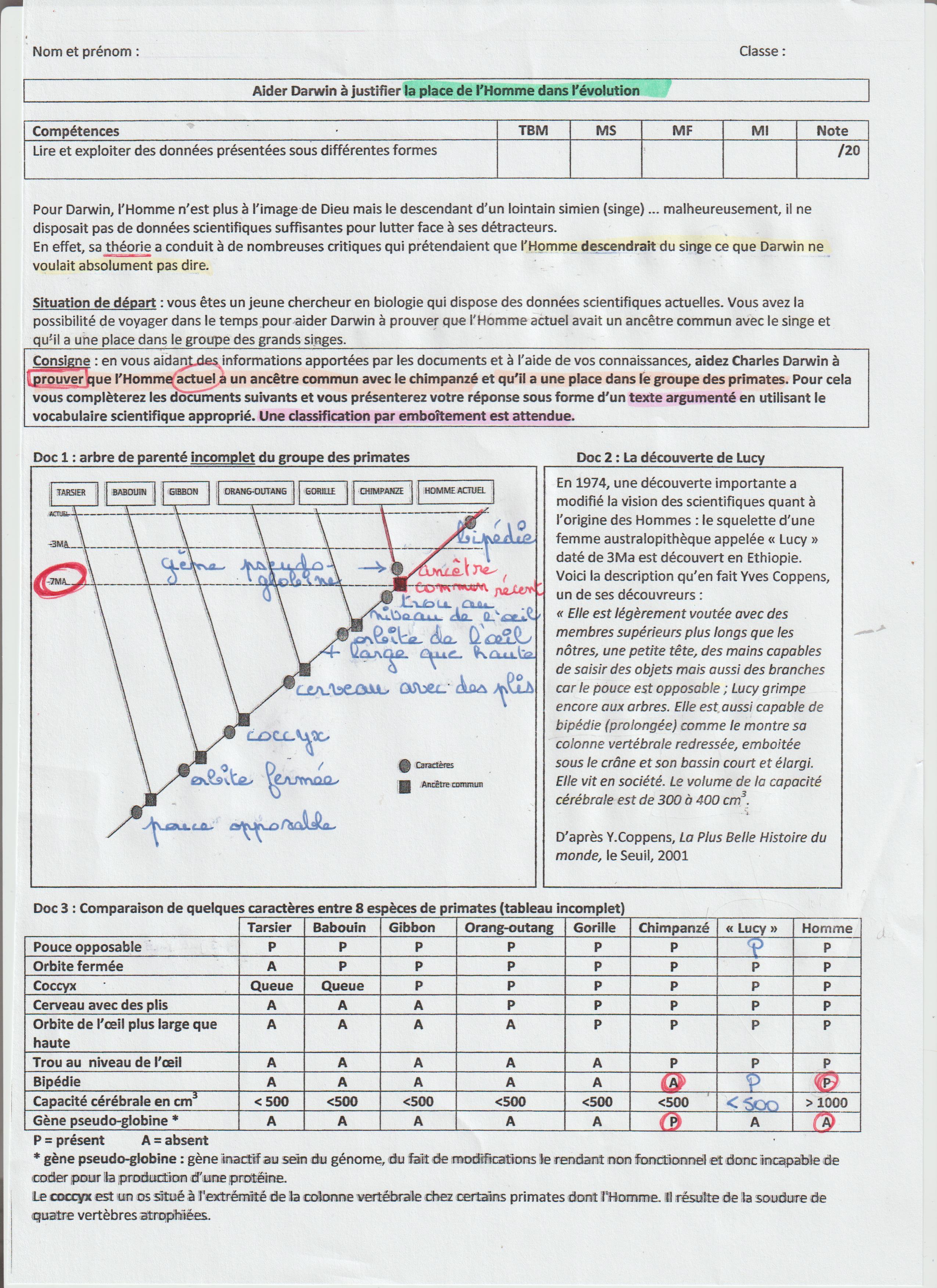 maël - missme Posté(e) le 1 mai 2019 Signaler Posté(e) le 1 mai 2019 voici mon travail D'une part, l'Homme actuel, appelé homo sapiens, a un ancêtre commun avec le chimpanzé. En effet, ils partagent des caractères communs comme nous pouvons le constater sur la classification emboîtée : pouce opposable aux autres doigts, orbite fermée, coccyx, cerveau avec des plis, orbite de l’œil plus large que haute et un trou au niveau de l’œil. De plus, cet ancêtre commun est récent car ces caractères partagés sont nombreux. Sur l'arbre de parenté, nous remarquons que l'homme actuel et le chimpanzé sont sur deux branches différentes et que le nœud à la réunion des deux branches se situent à 7 millions d'années. Par conséquent, c'est le dernier ancêtre commun. Cependant, le chimpanzé et homo sapiens présentent des caractères différents. Effectivement, le chimpanzé possède le gène pseudo-globine alors que chez l'Homme il est absent. Aussi, l'Homme actuel possède par rapport au chimpanzé un caractère nouveau : il se tient debout en permanence, c'est la bipédie. Il a également une capacité cérébrale plus importante comme le montre la classification emboîtée : supérieure à 1000 cm3 contre inférieure à 500 cm3. L' Homme actuel à donc un ancêtre commun récent avec le chimpanzé. D'autre part, l'Homme actuel a une place dans le groupe des primates. En effet, il possède des caractères communs avec le Tasier, le babouin, le gibbon, l'orang-orang-outan, le gorille et le chimpanzé qui sont des primates comme le montre le tableau du document 3. Par exemple, ils ont ont tous un pouce opposable aux autres doigts. Donc, l'Homme est un primate. Mais au cours de l'évolution, de nouveaux caractères apparaissent. Par exemple, chez le tarsier et le babouin on note la présence d'une queue alors que chez le Gibbon on remarque la présence d'un coccyx. Donc, l'Homme actuel a une histoire évolutive. En conclusion , nous pouvons dire que l'Homme actuel ne descend pas du singe car il a un ancêtre commun avec le chimpanzé donc il ne peut pas descendre du chimpanzé qui est un grand singe et parce que c'est lui même un singe (primate).