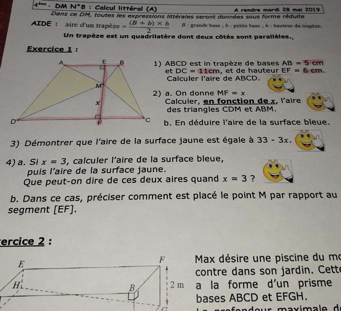 E-Bahut Barbidoux Posté(e) le 31 mai 2019 E-Bahut Signaler Posté(e) le 31 mai 2019 —————— aire AMB=5*(6-x)/2 Aire DCM=11*x/2 Aire surface jaune =48-5*(6-x)/2-11*x/2=33-3*x ——————— Je suppose que la surface bleue est celle du trapèze qui n’est pas jaune. Si c’est bien le cas alors Aire surface bleue=aitre trapèze-Aire surface jaune=48-(33-9)=24 cm^2 x=3 ==> Aire surface jaune =33-9=24 cm^2 les deux aires sont égales et M est au milieu de EF