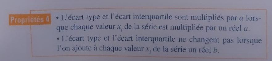 E-Bahut Barbidoux Posté(e) le 5 juin 2019 E-Bahut Signaler Posté(e) le 5 juin 2019 Lorsque tous les termes xi d'une série statistique sont multipliés par un réel a, sa variance est multipliée par a^2 et l'écart-type est donc multiplié par |a|.