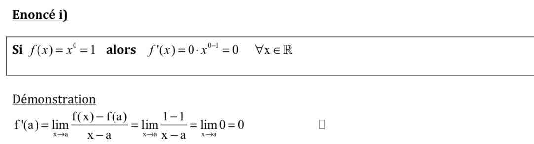 C8H10N4O2 Posté(e) le 21 juin 2019 Auteur Signaler Posté(e) le 21 juin 2019 Merci à tous, je crois que ça répond de plusieurs manières à ma question Une petite question subsidiaire : à propos de la dérivée de xn , n entier naturel . On suppose vrai à l'ordre n-1, et on a : Donc la formule est vérifiée à l'ordre n. Et on voit souvent écrit : comme la formule est vérifiée à l'ordre 0, elle l'est aussi à l'ordre 1, etc et finalement à tout ordre n. Mais ce que je ne comprends pas, et je crois l'avoir déjà mentionné sur ce forum, c'est que à l'ordre 0, on a : et donc pour moi, cela exclut 0 des valeurs de x pour lesquelles la formule est valable... Ci-dessous un exemple trouvé sur internet : J'avoue ne pas comprendre la démonstration proposée... Qu'en pensez-vous ?
