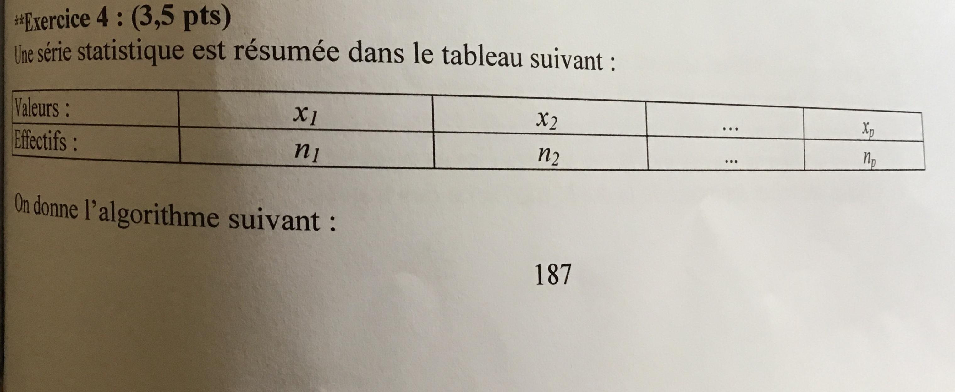 E-Bahut pzorba75 Posté(e) le 25 juin 2019 E-Bahut Signaler Posté(e) le 25 juin 2019 Cet algorithme affiche la moyenne des termes d'une série m=S/N avec S=somme{i=1à p}ni*xi et N=somme{i=1àp)ni. Pour plus de détails, tu peux te reporter à ton livre de classe où tout cela est expliqué en détail. Au travail.