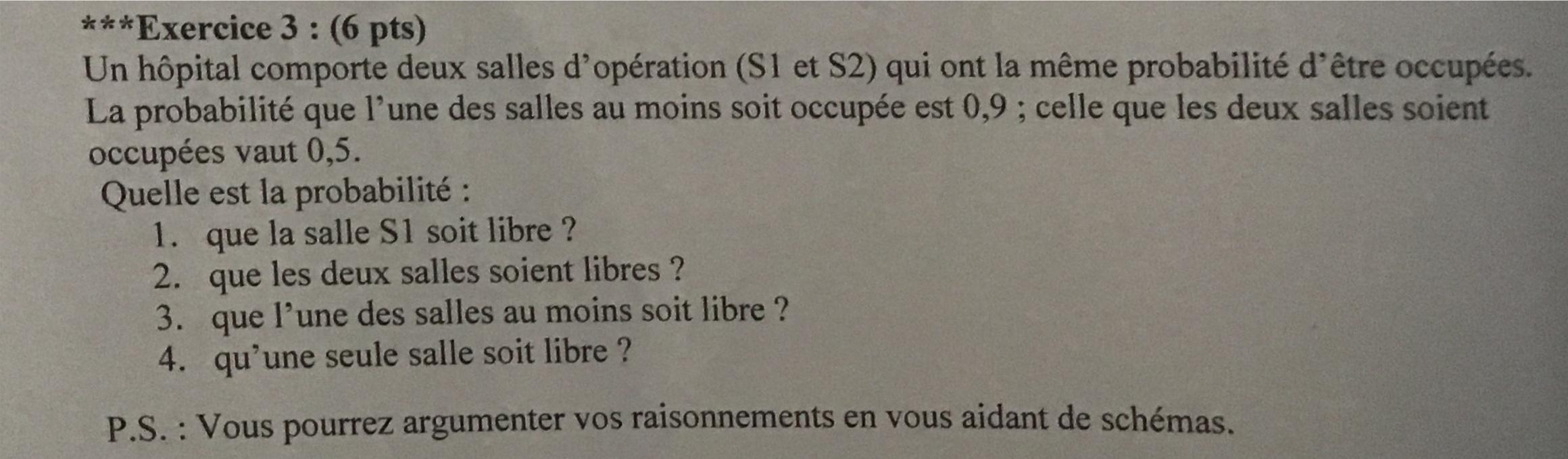 E-Bahut Boltzmann_Solver Posté(e) le 28 juin 2019 E-Bahut Signaler Posté(e) le 28 juin 2019 Bonsoir, Si on note les événements : - O1 : la salle S1 est occupée ; - O2 : la salle S2 est occupée. Peux tu me traduire l'énoncé à partir des notations proposées ci-dessus ?