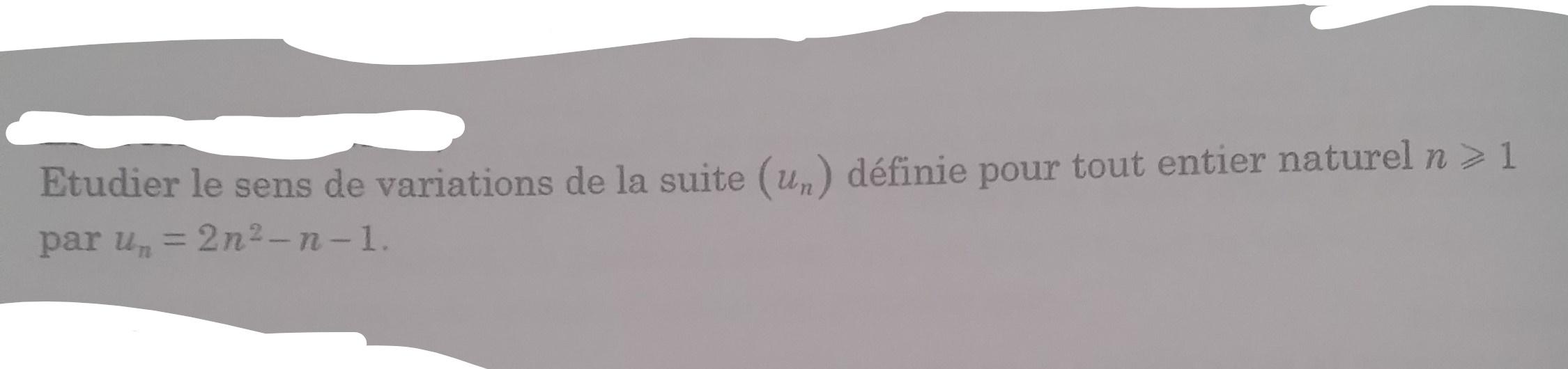 E-Bahut Barbidoux Posté(e) le 5 juillet 2019 E-Bahut Signaler Posté(e) le 5 juillet 2019 un+1-un=2*(n+1)2-(n+1)-1-(2*n2-n-1)=1+4*n >0 pour n≥1. La suite un est donc .....