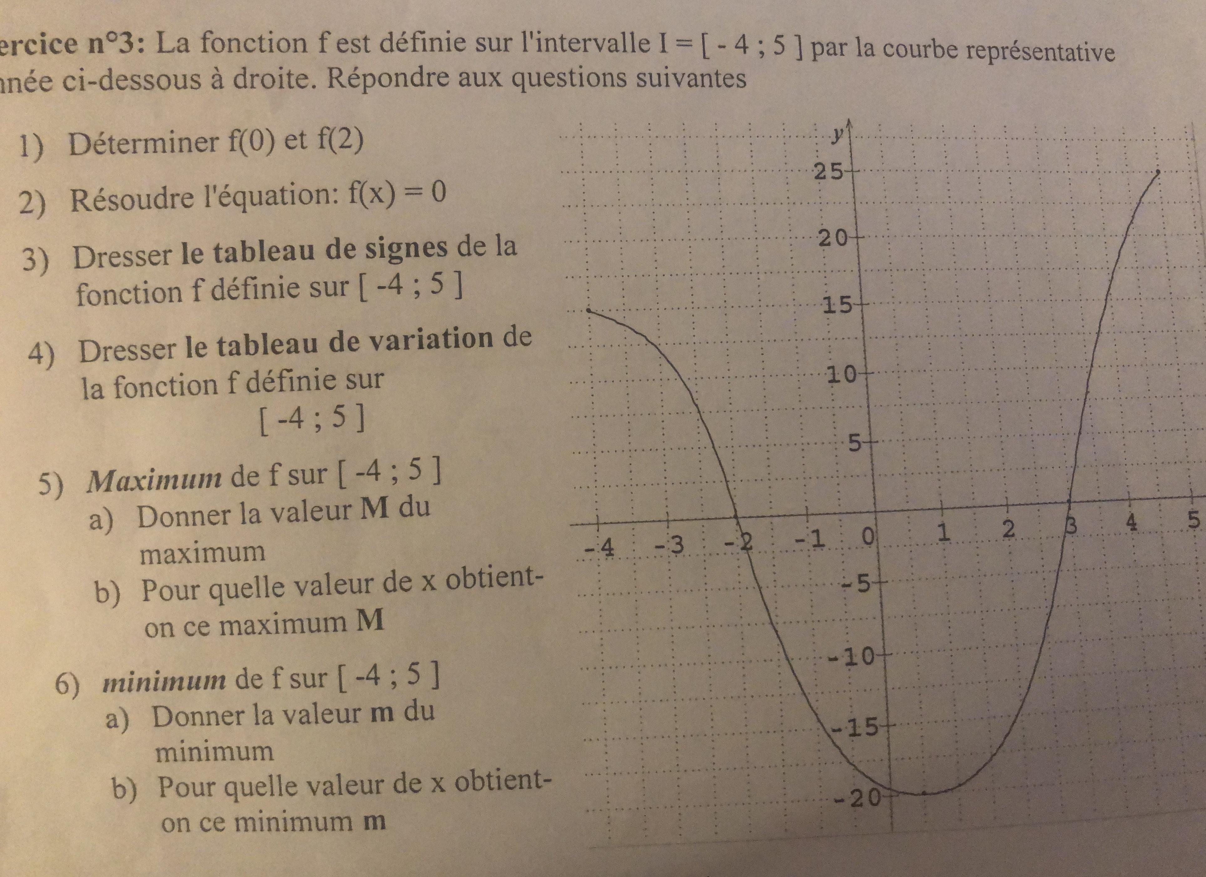 anylor Posté(e) le 7 septembre 2019 Signaler Posté(e) le 7 septembre 2019 bonjour, pour t'aider à commencer 1) pour le point x=0 , tu peux lire directement son image f(0) sur l'axe des ordonnées. pour f(2) tu pars du point d'abscisse 2 et tu traces un trait vertical de ce point à la courbe, et ensuite un trait horizontal de la courbe à l'axe des ordonnées. ça te permet de lire son image 2) f(x) =0 c'est lorsque la courbe coupe l'axe des abscisses. (horizontal) la courbe coupe 2 fois l'axe des abscisses, tu as donc 2 valeurs de x qui vont vérifier cette équation. 3) tableau de signes quand la courbe est au dessus de l'axe des abscisses, la fonction est positive inversement quand la courbe est au dessous, la fonction est négative