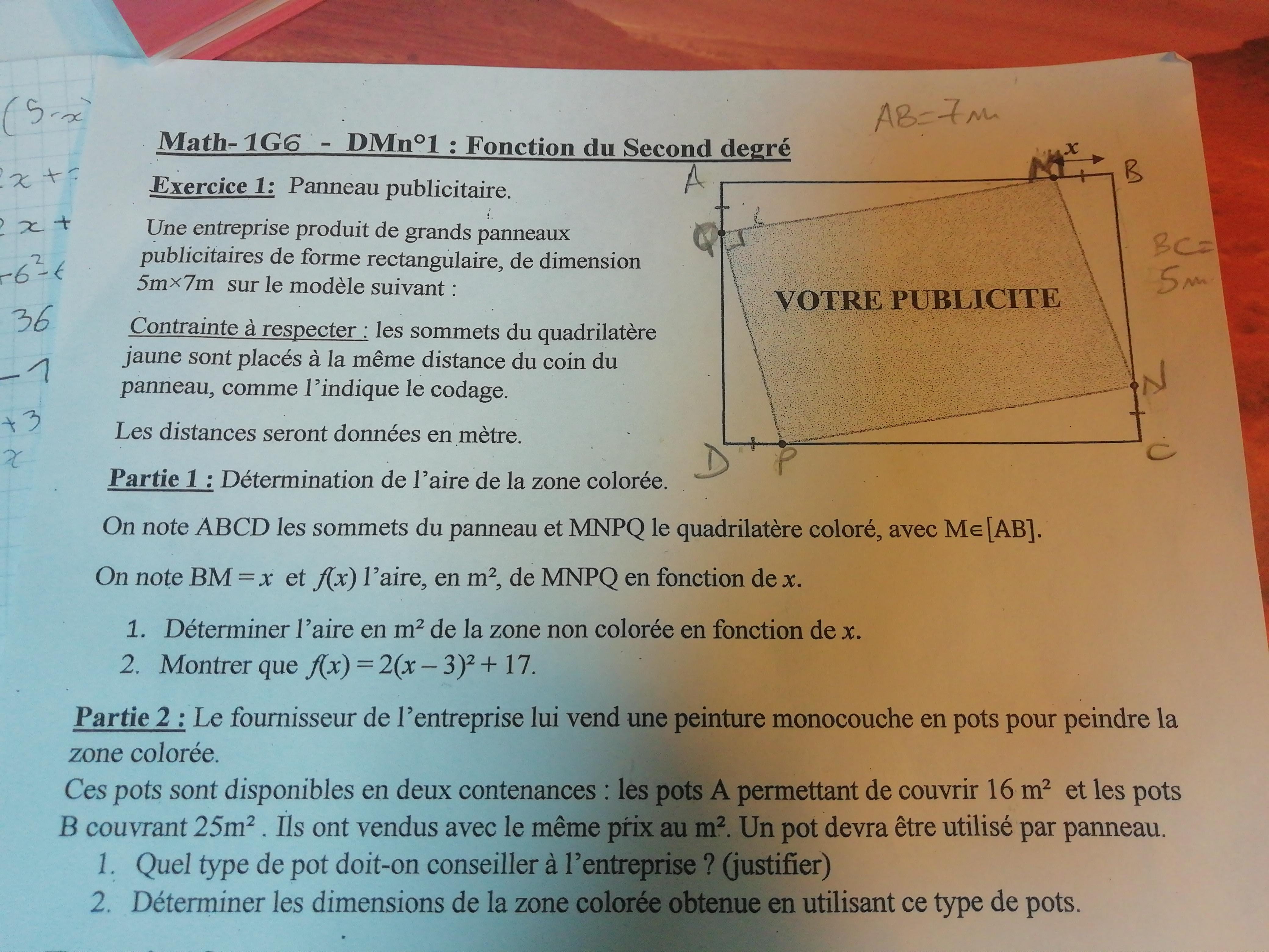 E-Bahut pzorba75 Posté(e) le 15 septembre 2019 E-Bahut Signaler Posté(e) le 15 septembre 2019 I) 1) L'aire de 2 triangles rectangles de coté x et 7-x et l'aire de deux triangles rectangles de côté x et 5-x. 2) L'aire du rectangle 5*7 diminuée de l'aire obtenue en 1. II) 2) Etudier s''il existe un réel x solution de f(x)=16 ou f(x)=25 à l’instant, pzorba75 a dit : I) 1) L'aire de 2 triangles rectangles de coté x et 7-x et l'aire de deux triangles rectangles de côté x et 5-x. 2) L'aire du rectangle 5*7 diminuée de l'aire obtenue en 1. II) 2) Etudier s''il existe un réel x solution de f(x)=16 ou f(x)=25 (en respectant une condition pour x).