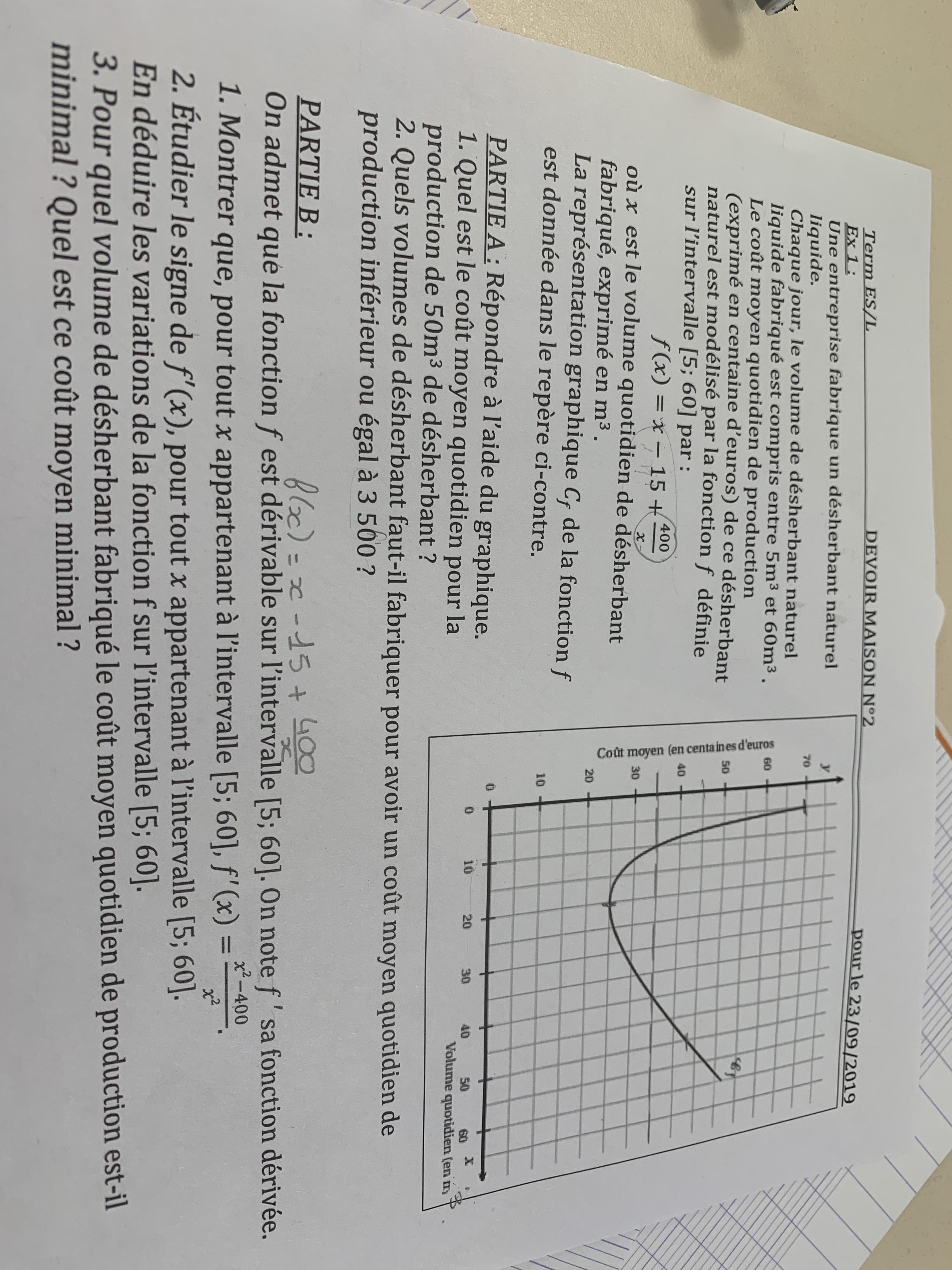 Julie67200 Posté(e) le 17 septembre 2019 Signaler Posté(e) le 17 septembre 2019 Bonjour je suis actuellement en classe de terminale es, j’ai un dm à rendre dans une semaine mais je ne comprends pas certaines questions j’aimerais si possible avoir de l’aide sur la partie b de l’exercice 1, j’ai essayé de dérivée la fonction mais je suis bloquée
