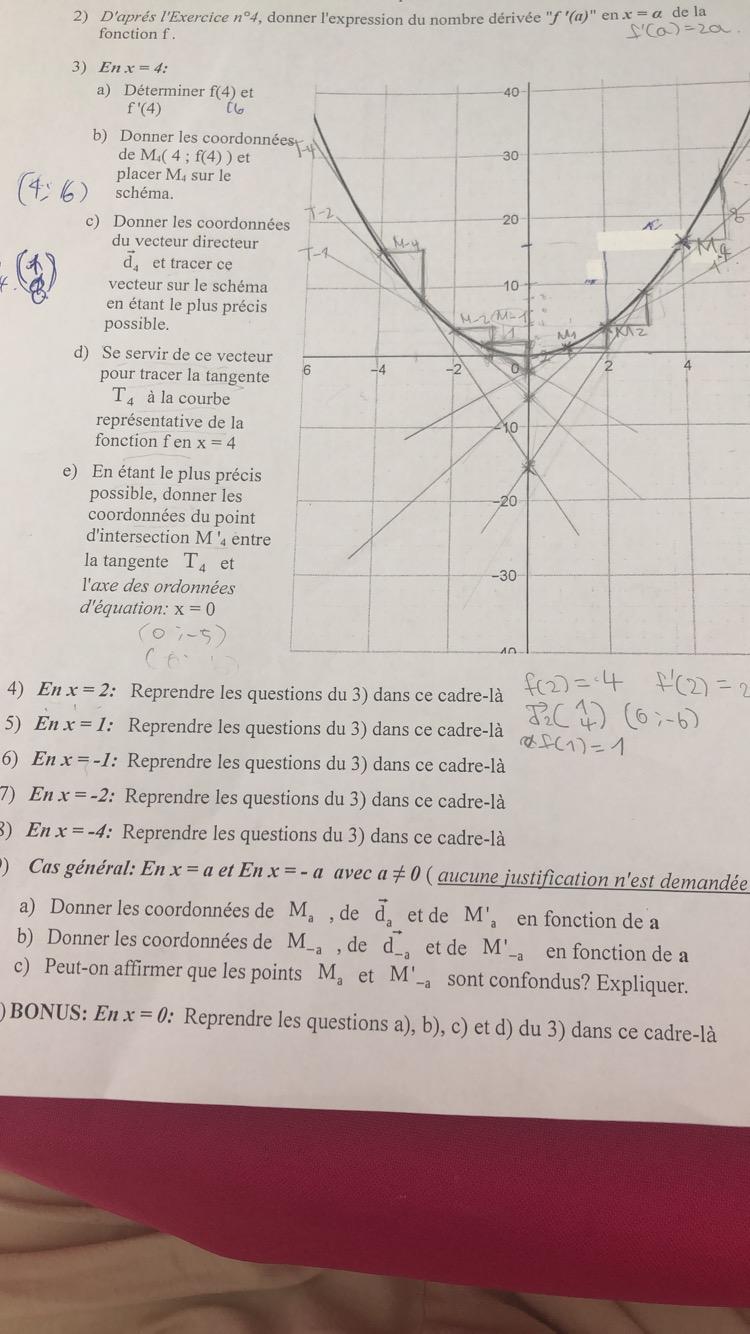 E-Bahut PAVE Posté(e) le 18 septembre 2019 E-Bahut Signaler Posté(e) le 18 septembre 2019 Bonsoir, Tu conviendras qu'il nous manque le début du problème . Je suppose (!!) que la courbe est la représentation graphique de la fonction "carré" qui a x fait correspondre f(x) = x². Apparemment à la question 2, tu as montré que si f(x) = x² alors f'(a) = 2a (c'est ce que tu as écrit sur l'énoncé. Question 3, on traite le cas où a=4 ! a) si a= 4 alors f'(4) = 8 (d'après 2) et bien sûr f(4) = 4² = 16 b) le point M4 de coordonnées x = 4 et y = f(4) = 16 est un point de la parabole d'équation y = x²,. c) on te parle d'un vecteur directeur d4 dont NOUS nous ne savons rien !!! (voir le début d'énoncé qui manque !!). On peut deviner mais ce n'est pas normal !!!!! La suite est logique .
