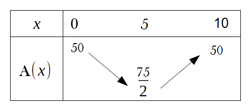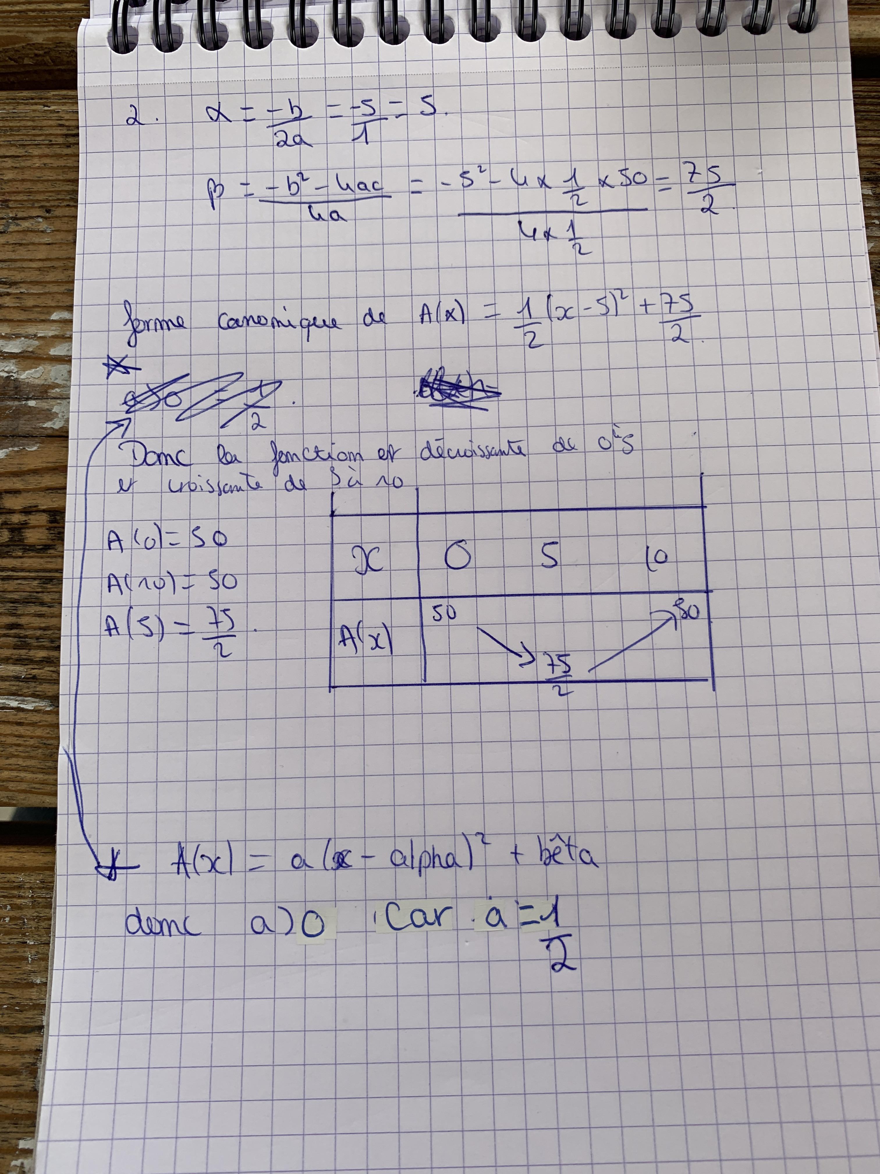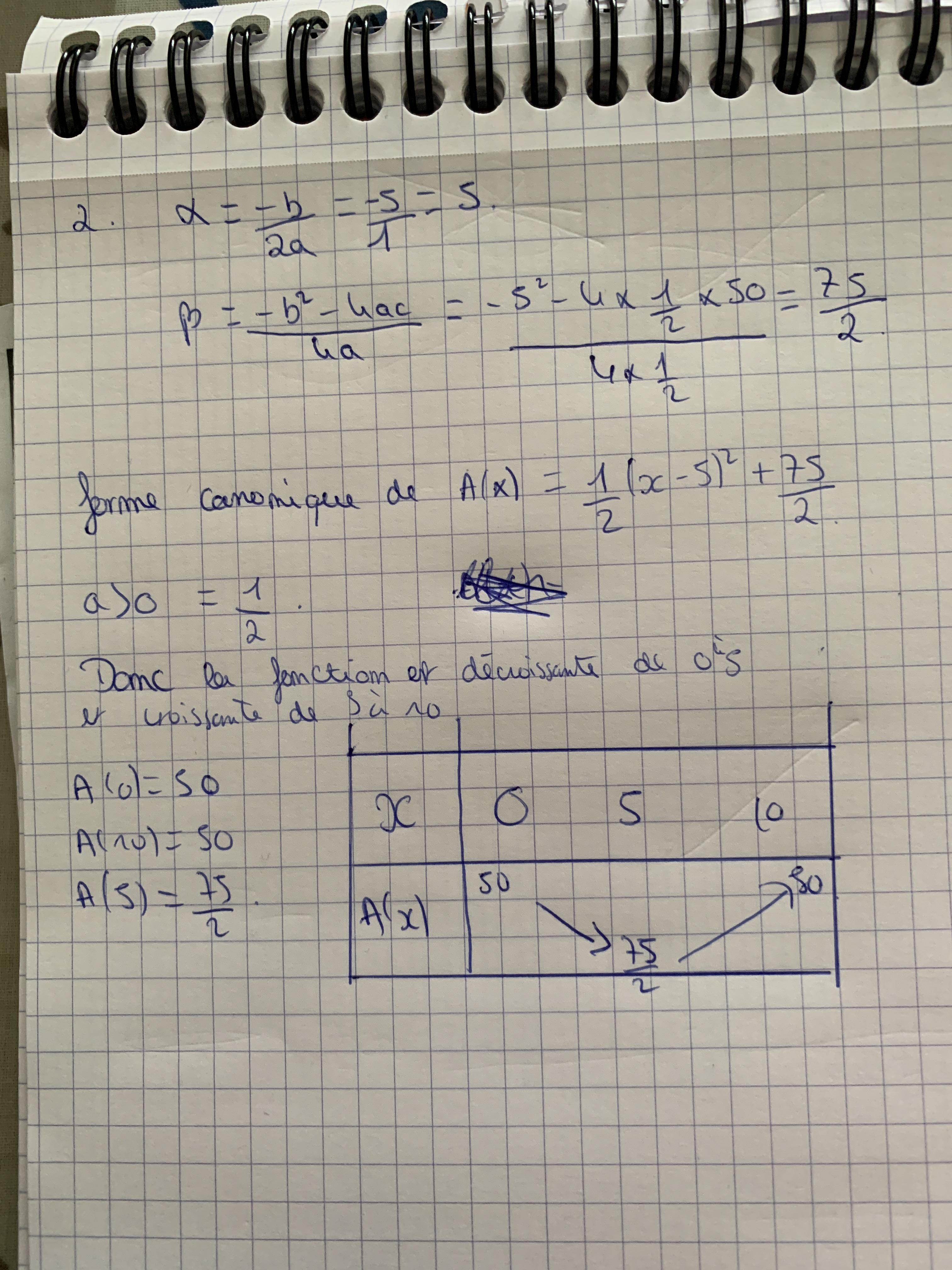 Nxmrtnzzzz Posté(e) le 25 septembre 2019 Auteur Signaler Posté(e) le 25 septembre 2019 il y a 19 minutes, anylor a dit : en fait j'ai parlé de forme canonique pour te mettre sur la voie mais les coordonnées du sommet (alpha; bêta ) suffisent alpha = -b/ (2a) = 5 et bêta =A(alpha) = 75/2 forme canonique de A(x) = 1/2 (x-5)² + 75/2 a>0 car égal à 1/2 donc la fonction est décroissante de 0 à 5 (abscisse du sommet) puis croissante de 5 à 10 pour compléter ton tableau calcule et rajoute A(0) ; A(5) et A(10) Je vais essayer merci beaucoup