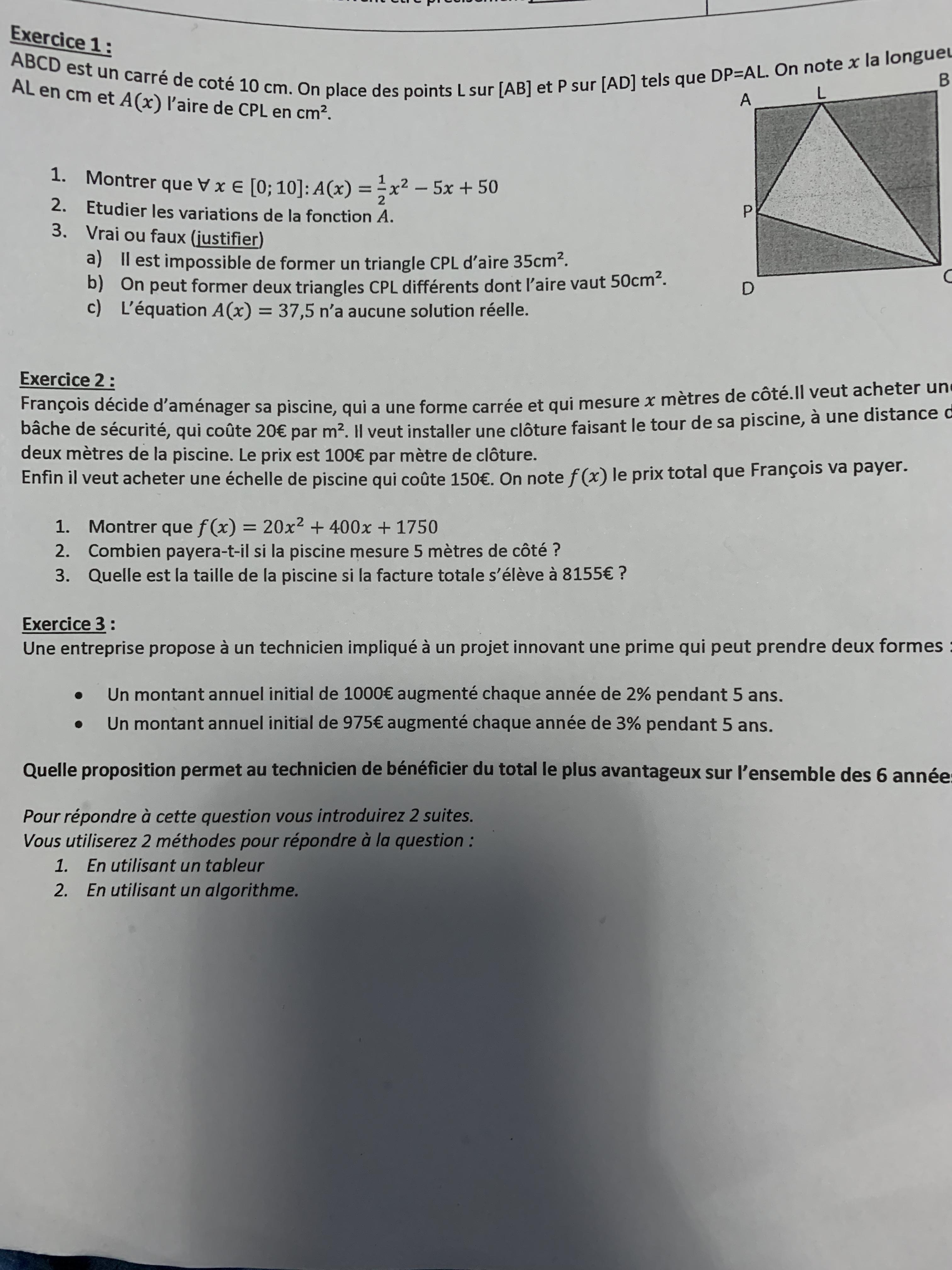Nxmrtnzzzz Posté(e) le 25 septembre 2019 Auteur Signaler Posté(e) le 25 septembre 2019 Il y a 10 heures, anylor a dit : bonjour as tu commencé ? quel est l'exercice qui te pose problème? pour l'exercice 1 0 ≤ x ≤ 10 car x est une longueur donc toujours positif ou nul et il appartient au côté du carré donc inférieur ou égal à 10. Pose toutes les mesures : BC = CD =10 DP=AL =x AP=LB = 10 -x puis calcule l'aire grise. ensuite tu pourras trouver A(x) en déduisant l'aire grise de celle du carré ABCD. pour étudier les variations de A(x) tu peux le faire en te servant de la forme canonique de A(x) ou en calculant sa dérivée. Merci beaucoup mais je ne comprend pas les calculs que je doit faire c’est ça le probleme et j’ai du mal avec les exercices 1 et 2