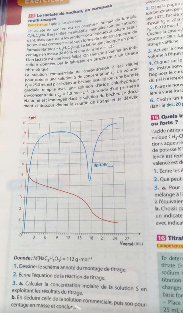 E-Bahut Barbidoux Posté(e) le 2 octobre 2019 E-Bahut Signaler Posté(e) le 2 octobre 2019 3a————————— Veq=17.7 relation d’équivalence n(C3H5O3^(-)) =n(H3O^(+)) ==>C(C3H5O3^(-)) *V(C3H5O3^(-))=C(HCl)*Veq C(C3H5O3^(-))=C(HCl)*Veq/V(C3H5O3^(-))=1.0*17.7/25=0.708 mol/L 3b————————— Impossible de faire cette question sans connaitre le facteur de dilution de la solution de lactate commerciale Encore un livre dont les énoncés de exercices n'on pas été relus ..... mauvais livre à éviter ....