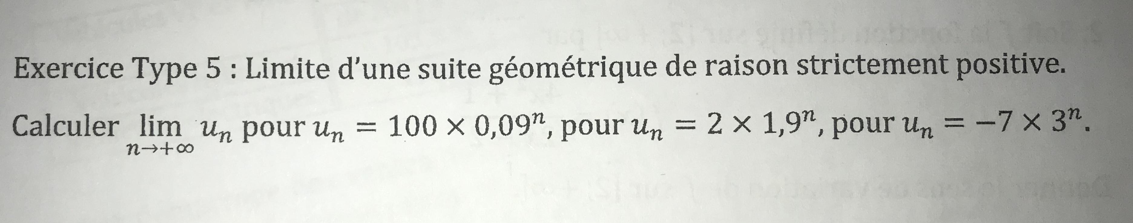 anylor Posté(e) le 11 octobre 2019 Signaler Posté(e) le 11 octobre 2019 bonjour Un est une suite géométrique forme Uo * qn 1) Un = 100 * 0,09n la raison q est comprise entre 0 et 1 donc la suite est décroissante ( théorème) 0 < q < 1 la limite de Un quand n tend vers +oo = -oo 2) Un = 2 * 1,9n la raison q > 1 la suite est croissante (théorème) donc ............ je te laisse finir