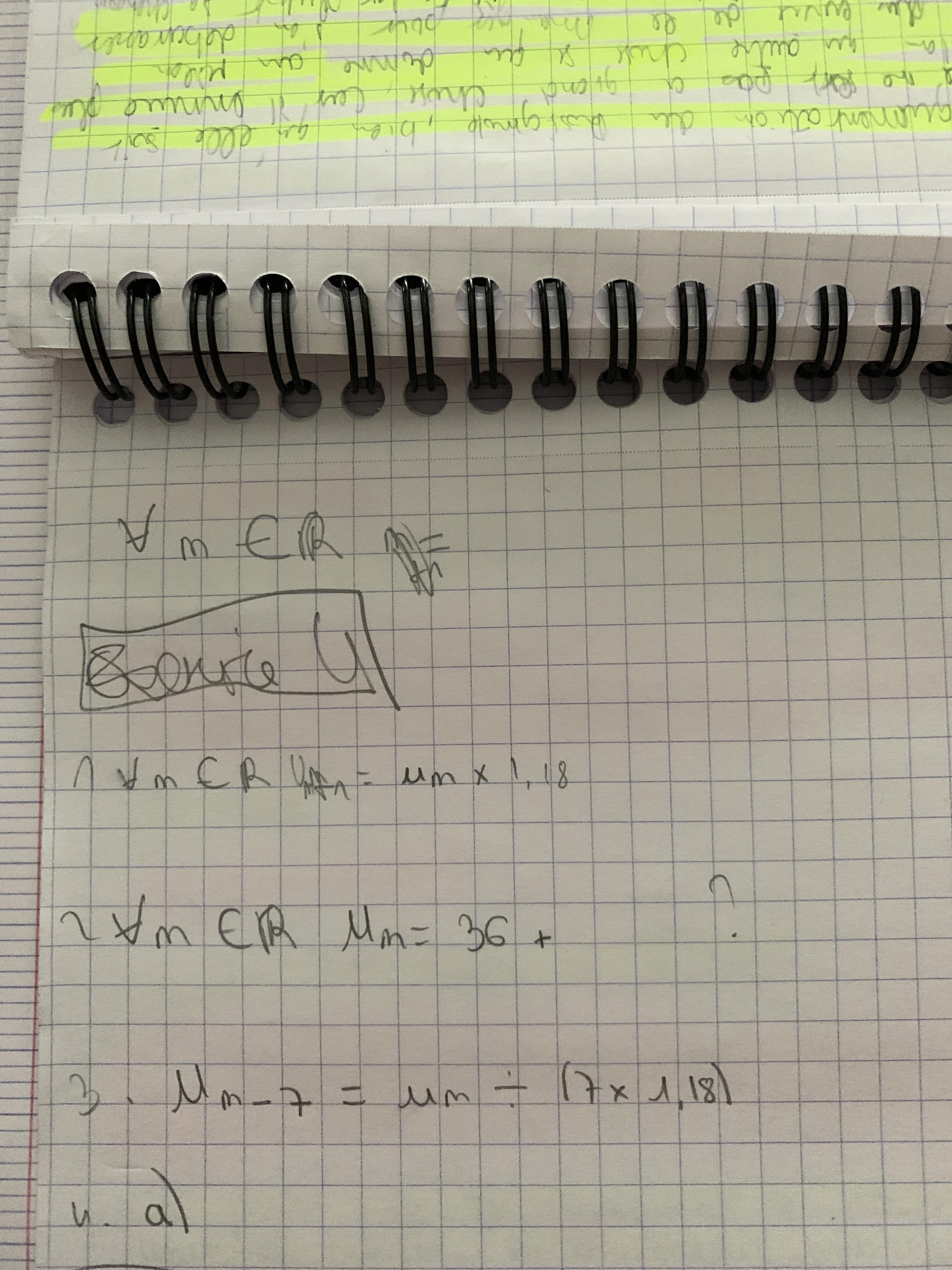 Nxmrtnzzzz Posté(e) le 14 octobre 2019 Auteur Signaler Posté(e) le 14 octobre 2019 il y a 17 minutes, julesx a dit : 1) Tu reprends la définition : L'augmentation annuelle est de 1,8%, donc le volume pour l'année suivante est le volume précédent multiplié par 1,018, d'où un+1=1,018*un. 2) C'est dans le cours ! Pour une suite géométrique, le terme de rang n est donné en fonction du terme initial u0 et de la raison ρ par un=u0*ρn avec u0=36 et ρ=1,018. 3) n=2040-2017=... que tu reportes dans l'expression de un. Je n’est pas le cour en entier on le fait au fure et a mesure donc je n’est pas toutes ces formules! Et je ne comprend pas quel phrase je doit faire pour la 2 et la 3