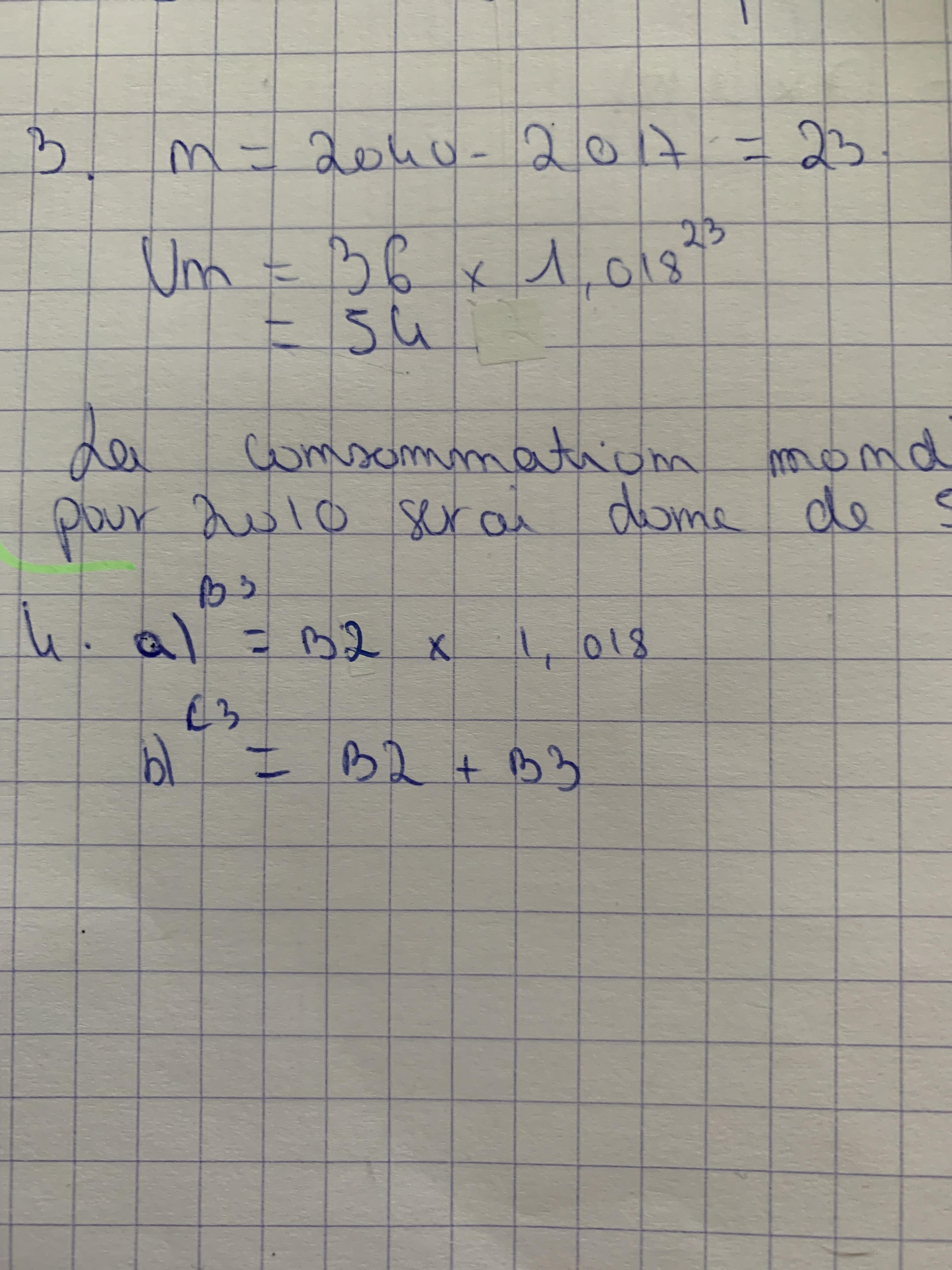 E-Bahut julesx Posté(e) le 15 octobre 2019 E-Bahut Signaler Posté(e) le 15 octobre 2019 Mais tu peux aussi dire dans ton devoir qu'avec ton tableur, tu as trouvé que la consommation totale en 2050 est de 1668 barils... Sinon, il y a une formule pour la somme des termes d'une suite géométrique : S=u0*( ρn+1-1)/( ρ-1) avec n=2050-2017 avec u0=36 et ρ=1,018 cf. mon post initial.