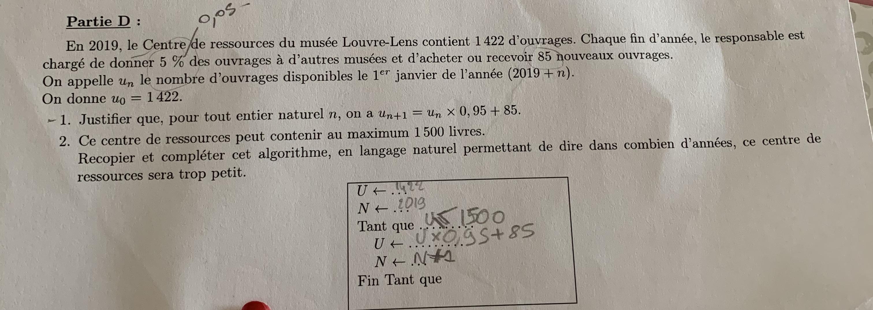 anylor Posté(e) le 28 octobre 2019 Signaler Posté(e) le 28 octobre 2019 bonjour pour l'algorithme c'est ok en langage naturel ça donne : u prend la valeur 1422 n prend la valeur 2019 tant que U est inférieur ou égal à 1500 U prend la valeur U*0,95 +85 n prend la valeur n +1 fin de la boucle tant que mais il te manque 1 ligne afficher N ton algorithme doit afficher 2026
