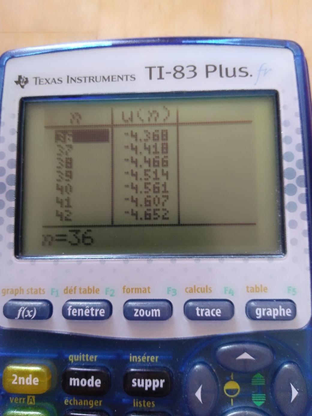 C8H10N4O2 Posté(e) le 13 novembre 2019 Signaler Posté(e) le 13 novembre 2019 Bonjour à tous ! J'ai une petite question pour la question 5)b. de l'exercice 3 : Sur TI, je sais calculer un terme u(n) après avoir rentré les données de la suite (simplement en revenant à l'écran de calcul puis commande " u(n) = " ) Mais comment procède-t-on pour résoudre une inéquation comme ici demandé ? Question subsidiaire : comment puis-je modifier la valeur de n sur l'écran ci-dessous ? Par exemple pour revenir à n=0 ou aller à n=50 sans passer une demi-heure à appuyer sur les flèches haut ou bas