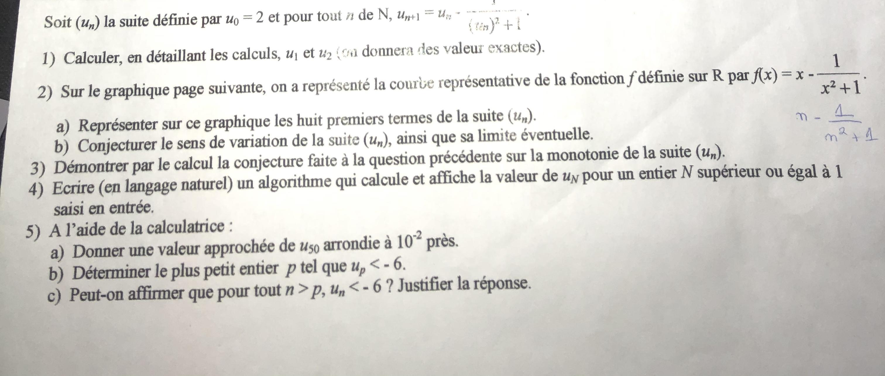 lea.vinted Posté(e) le 2 novembre 2019 Signaler Posté(e) le 2 novembre 2019 Bonjour j’aurais besoin de l’aide pour cet exercice il y a des choses que j’ai réussi comme la première question sauf que je n’ai pas détailler les calculs je n’y arrive pas mais j’ai trouvé 1/2 pour u1 et 9/4 pour U2 Pour la 2a l’exercice est fait sur ma feuille pour la 2B la réponse : on peut conjecturer que la suite (un) est décroissante on dit que la suite (un) a pour limite -~ et on note : lim (un) = -~ On dit alors que (un) diverge vers -~ ou qu’elle est divergente de limite -~ Pour la 3et 4 je n’ai pas réussi Pour la 5 à) u50 = -4,98 et pour la b et c je n’ai pas réussi non plus
