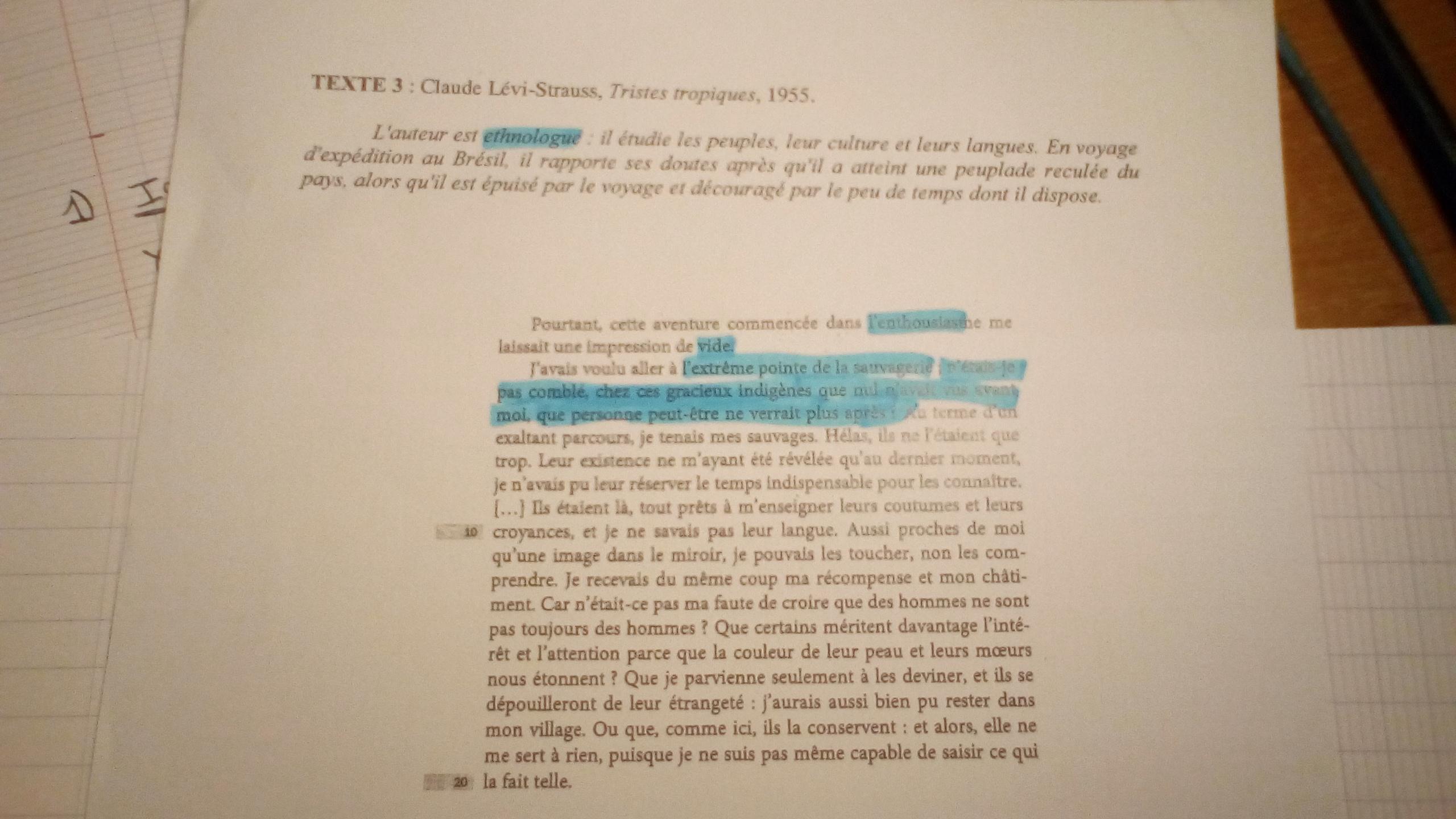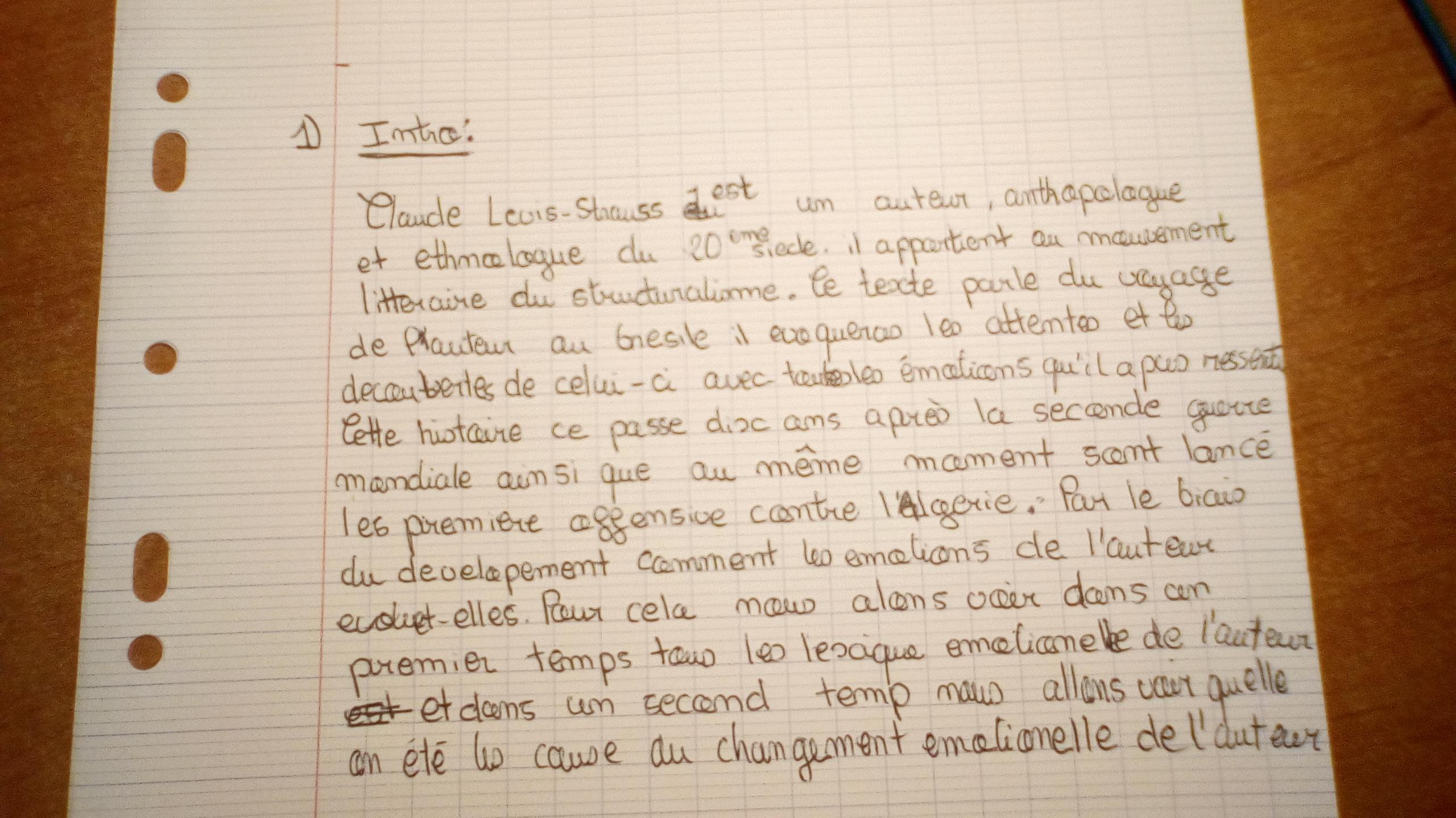 Thiais Posté(e) le 3 novembre 2019 Auteur Signaler Posté(e) le 3 novembre 2019 Peut-être que sous format texte plus de personnes auront envie de me corriger donc voici : Claude Levis Strauss est un auteur, anthropologue et ethnologue du 20e siècle. il appartient au mouvement littéraire du structuralisme. Ce texte parle du voyage de l'auteur au Brésil. Il évoquera les attentes et les découvertes de celui-ci avec toutes les émotions qu'il a pu ressentir. Cette histoire se passe dix ans après la Seconde Guerre mondiale ainsi qu'au même moment sont lancées les premières offensives contre les insurgés algériens .Par le biais de ce développement nous allons voir comment les émotions de l'auteur évolue-t-elles. Pour cela nous allons voir dans un premier temps tous les lexiques émotionnels misé en évidence dans le texte par l'auteur et dans un second temps nous allons voir qu'elles ont été les causes du changement émotionnel de l'auteur.