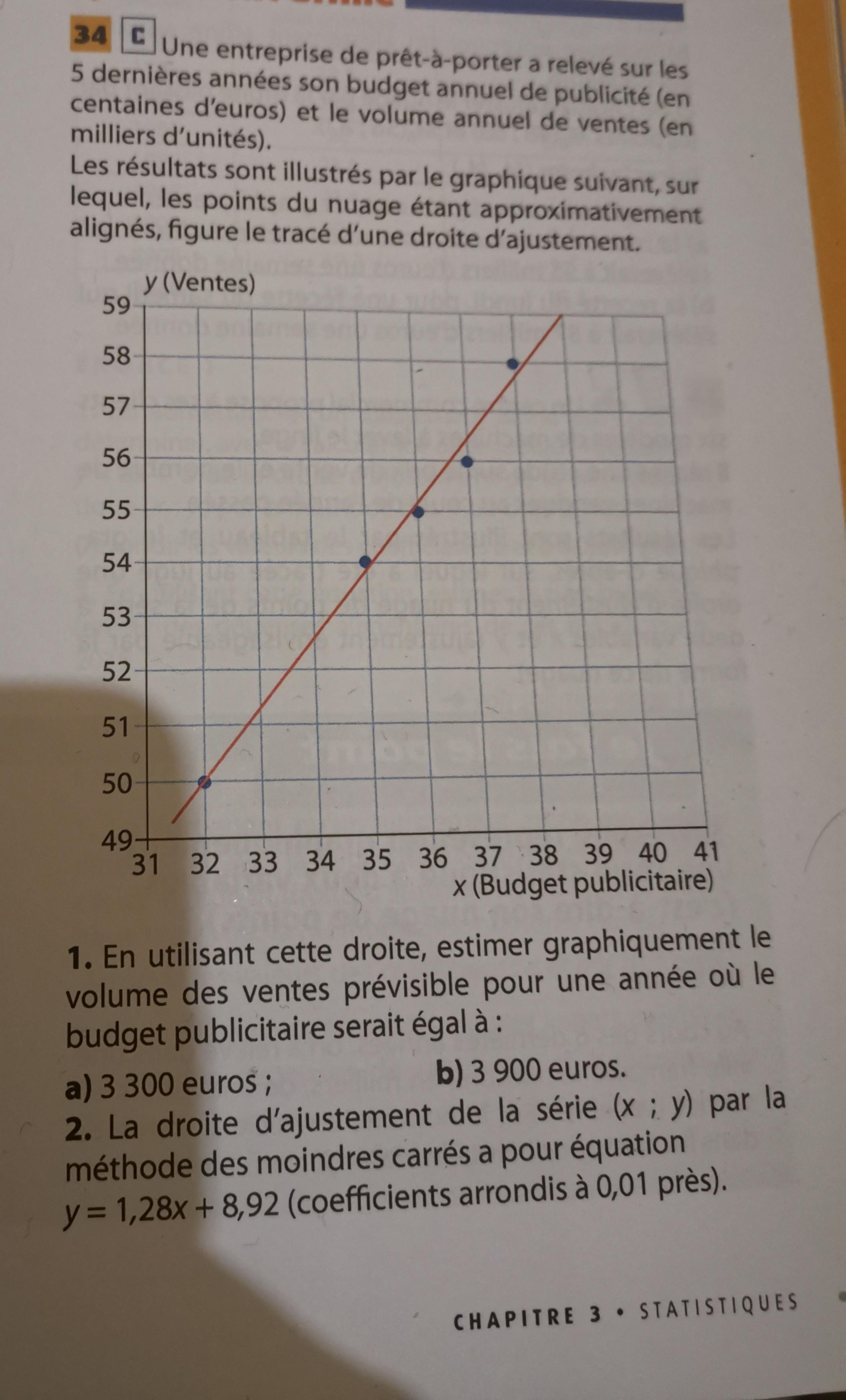 gers Posté(e) le 6 novembre 2019 Auteur Signaler Posté(e) le 6 novembre 2019 C'est juste : 1)Par lecture graphique: Pour un budget publicitaire de 3 300€, le volume de ventes prévisible pour une année sera de 51,25. Pour un budget publicitaire de 3 900€, le volume de ventes prévisible pour une année sera de 59. 2) Il faut remplacer x par les valeurs indiquées ( 33 et 39 ). y=1,28x+8,92 Pour un budget publicitaire de 3 300 €:1,28×33+8,92=51,16. Pour un budget publicitaire de 3 900 €:1,28x39+8,92=58,84.