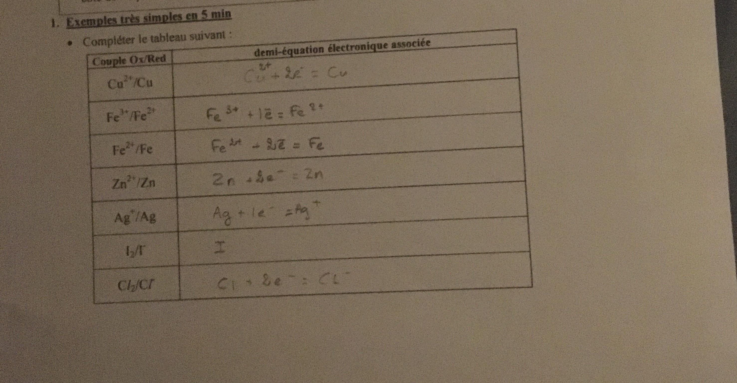 E-Bahut Barbidoux Posté(e) le 11 novembre 2019 E-Bahut Signaler Posté(e) le 11 novembre 2019 Les trois derniers sont à revoir : Ag ++e- = Ag I2+2*e- =2*I- Cl2+2*e- =2*Cl-