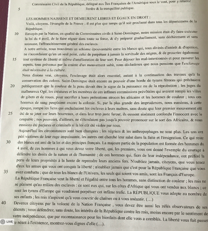 Duhautkathleen Posté(e) le 18 novembre 2019 Signaler Posté(e) le 18 novembre 2019 Bonjour, J'ai un plan de commentaire à réaliser pour mardi prochain. J'ai déjà bien avancé, et je pense posséder l'ensemble des données, mais je n'arrive pas à organiser mon propos dans un plan cohérent (selon moi...) Voici ce que j'ai fait pour l'instant : INTRODUCTION “Tous les hommes naissent et demeurent libres et égaux en droit” : ce principe, solennellement proclamé dans la Déclaration des droits de l’Homme et du citoyen de 1789, est alors aux antipodes de la pratique de l’esclavage. Des débats auront ainsi lieu dès le début de la Révolution concernant sa perpétuation. Certains, à l’image de Barnave, défendent les intérêts économiques nationaux, quand d’autres se battent sur le terrain des principes. C’est le cas de Léger-Félicité de Sonthonax, abolitionniste convaincu. Né en 1763, homme de lois puis député aux côtés de la Gironde, il est proche de la Société des Amis des Noirs et publie, dès 1790, des articles défendant les thèses abolitionnistes. C’est ainsi qu’en avril 1792, il est choisi aux côtés de deux autres députés girondins, Polverel et Ailhaud, afin de former une Commission à destination de Saint-Domingue. Celle-ci a pour mission de rétablir l’ordre face à la révolte des esclaves, et de faire appliquer la loi du 4 avril 1792. Parallèlement à sa mission dans la colonie, les thèses abolitionnistes progressent en métropole, avec notamment la Société des Amis des Noirs, et la Légion des Américains, dont la campagne abolitionniste mobilise l’opinion en juin 1793. C’est également en juin 1793 qu’est votée la nouvelle déclaration des droits, dont l’article 18 est une porte ouverte à l’abolition. Mais c’est par Sonthonax que sera prise cette décision, par sa Proclamation du 29 août 1793. Il s’agit d’une déclaration publique ayant pour but de faire connaître une décision officielle, dans le cas présent un décret où Sonthonax aboli l’esclavage, au nom de la République Française. PB : En quoi Sonthonax par le biais de cette proclamation nous démontre à la fois une décision de circonstances, et une volonté de mise en application de principes ? PLAN II. Saint-Domingue : la Révolution dans les colonies ? Les idéaux révolutionnaires traversent l’Atlantique D’Ogé à la loi du 4 avril 1792 : le combat des libres de couleur... Dont s’inspirent les esclaves, soulevés depuis 1791… II. Du mythe de l’abolition graduelle à l’abolition pure et simple… “L’esclavage est nécessaire à la culture” : l’esclavage, mode de production… L’irruption de la guerre face à d’infâmes royalistes… où l’abolition devient un moyen de rallier des combattants III. Des principes révolutionnaires et leur application De nouveaux libres, pourvus de droits… et de devoirs, en vertus de la DDHC Organiser la production : pour un retour au W Mais un régime particulier… des citoyens incomplets ? Seulement, le plan me semble assez déséquilibré, j'y réfléchis depuis des jours et je ne trouve plus rien. Je ne demande bien sûr pas de faire le travail à ma place, mais si quelqu'un a des idées, je serais heureuse d'en discuter. (texte-ci joint).