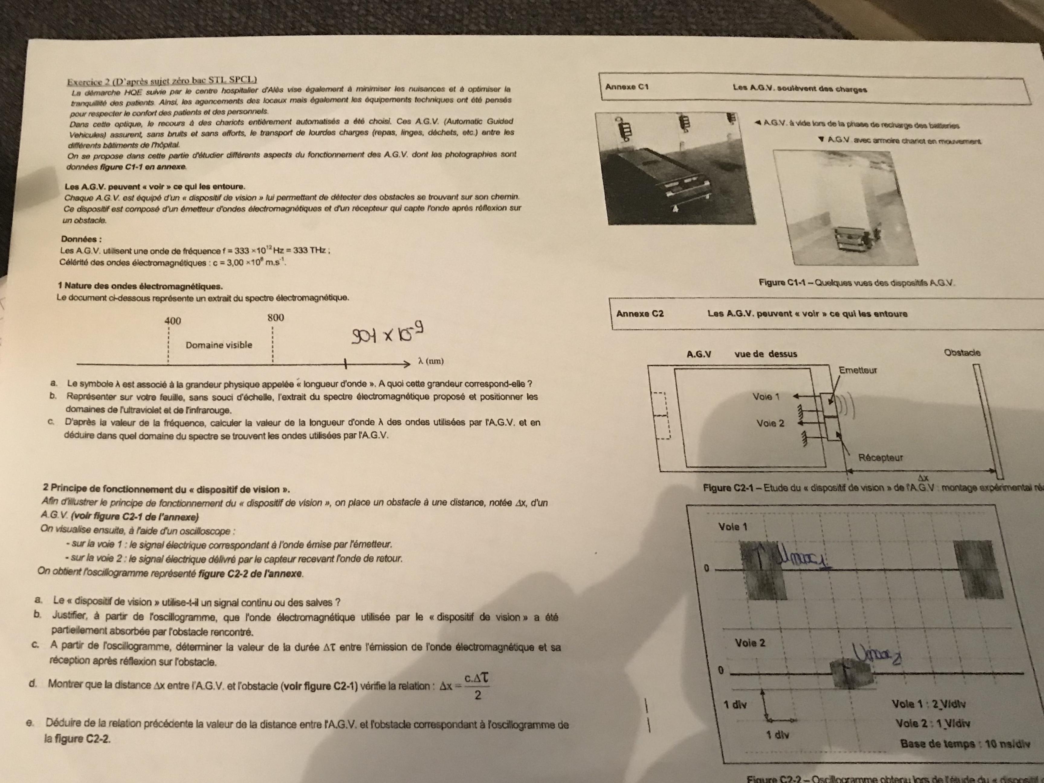 E-Bahut Barbidoux Posté(e) le 19 novembre 2019 E-Bahut Signaler Posté(e) le 19 novembre 2019 Sujet qui aurait du être posté sur le forum sciences..... 1a---------------------- La longueur d’onde est une une longueur, caractéristique d'une onde monochromatique dans un milieu homogène, définie comme la distance séparant deux maxima consécutifs de l'amplitude. 1b---------------------- U.V <400 Violet[ ...........] 800 Rouge <infra rouge 1c---------------------- lambda = C/nu=3*10^8/(333*10^12)=9.00*10^(-7) m =900 nm Domaine I.R 2a---------------------- Salves 2b---------------------- amplitude de signal de retour plus faible 2c---------------------- ∆T=2.5 ns 2d---------------------- ∆t*C=2*x ==> x=c*√t/2=3*10^(8)*2.5*10^(-8)/2= 3.75 m