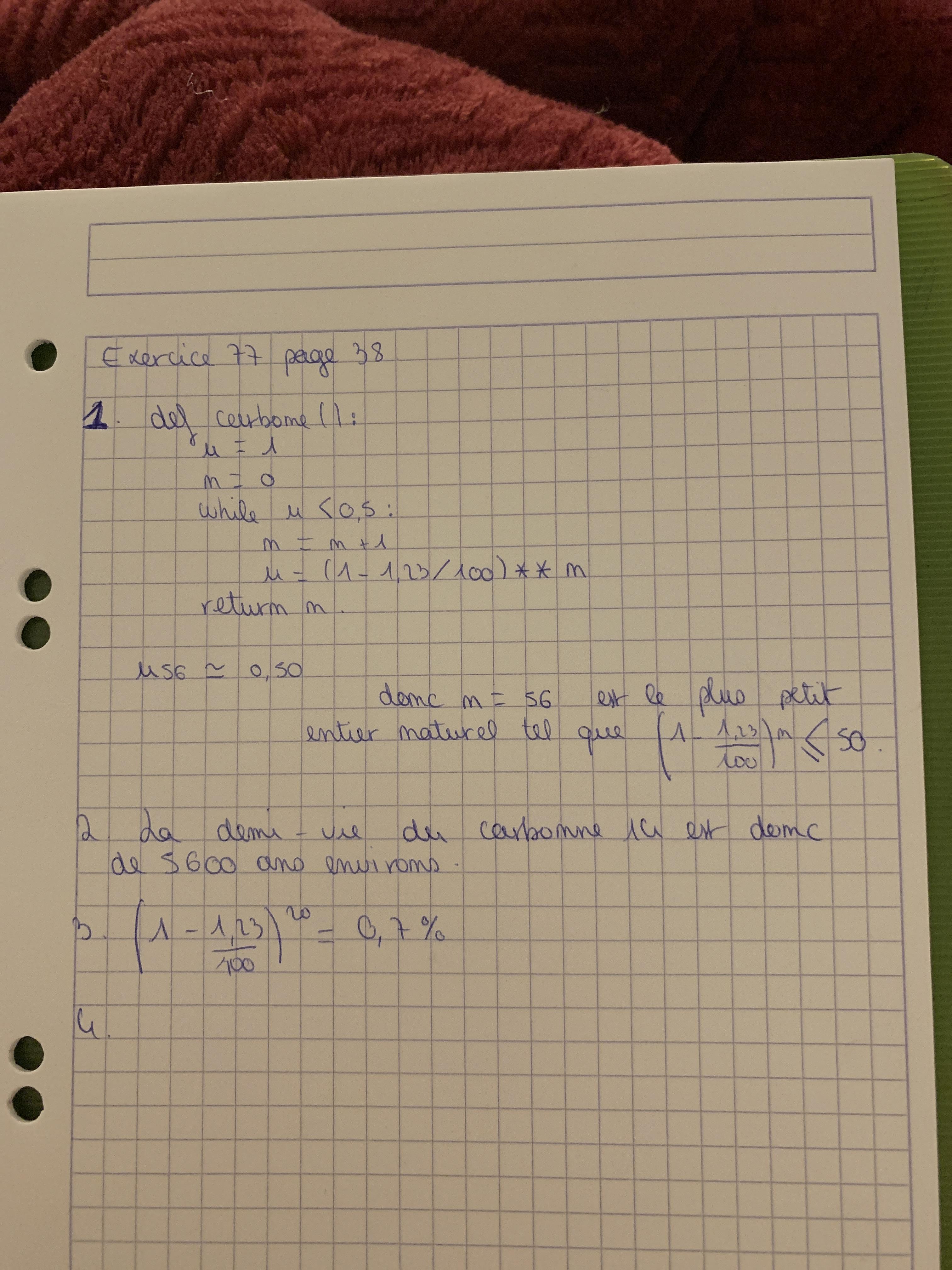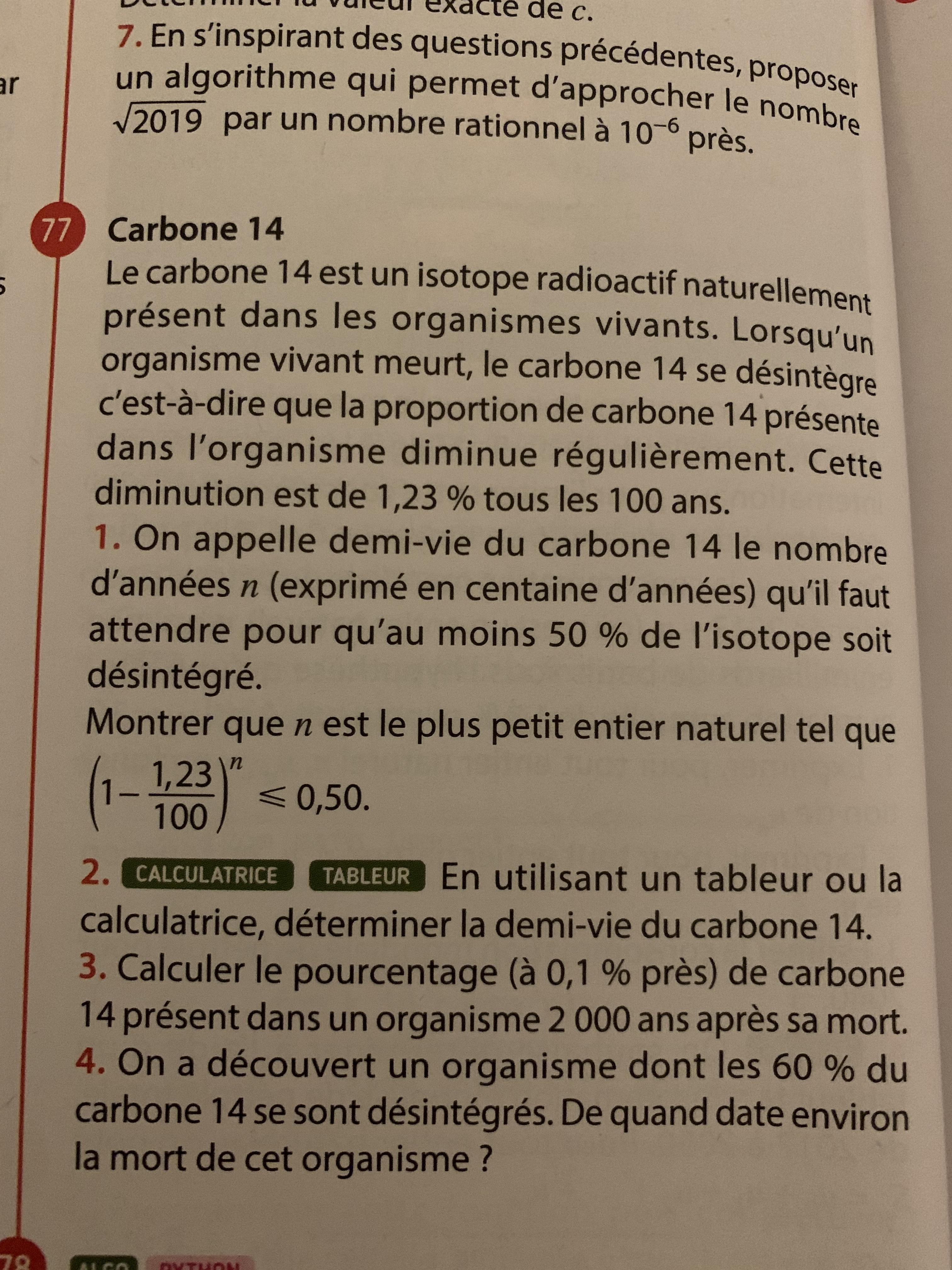 Nxmrtnzzzz Posté(e) le 25 novembre 2019 Auteur Signaler Posté(e) le 25 novembre 2019 il y a 3 minutes, julesx a dit : Bonjour, Pour l'exercice 77, il faut simplement voir que, tous les 100 ans, la proportion de carbone 14 diminue de 1,23%, donc que la proportion est multipliée par (1-1,123/100). Au bout de n centaines d'années, la proportion d'isotopes qui est désintégrée est donc de (1-1,23/100)n %. Comme on définit la demi-vie par 50% de désintégration, la valeur de n correspondante est telle que (1-1,23/100)n 0,50. Pour les questions suivantes, c'est du calcul. J’ai reussi les autres question sauf la derniere j’ai essayer plusieurs calcul mais ils ne sont pas bon Et desoler mais je relie votre raiponse mais sa ne me dit pas comment montrer que n est le plus petit entier naturel tel que (1-1.23/100)n<0,50