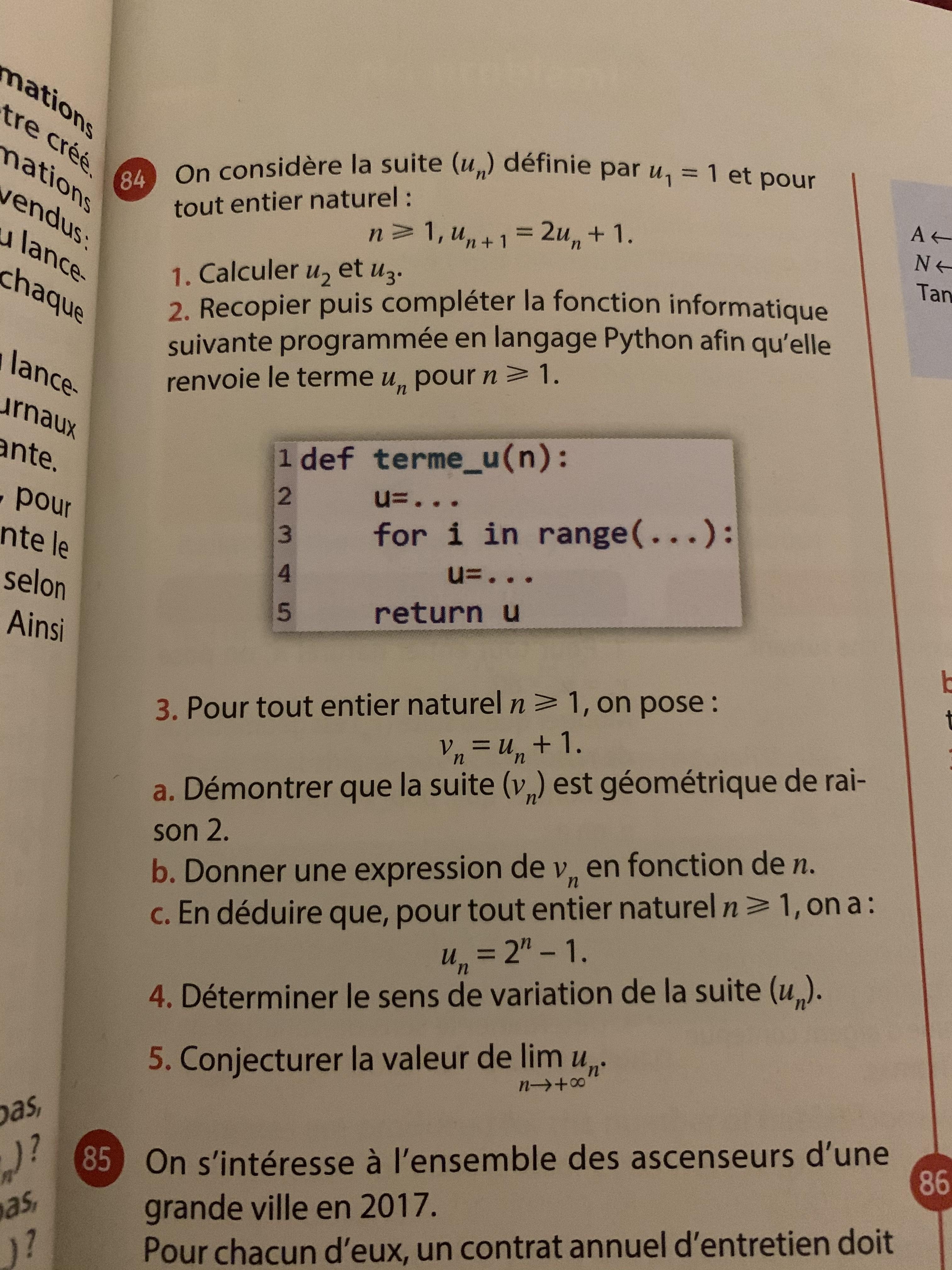 E-Bahut pzorba75 Posté(e) le 26 novembre 2019 E-Bahut Signaler Posté(e) le 26 novembre 2019 Pour le programme Python définissant la suite (un) : In [6]: def terme_u(n): ...: u=1 ...: for i in range(2,n+1): ...: u=2*u+1 ...: return u ...: print(terme_u(1),terme_u(2),terme_u(3)) 1 3 7