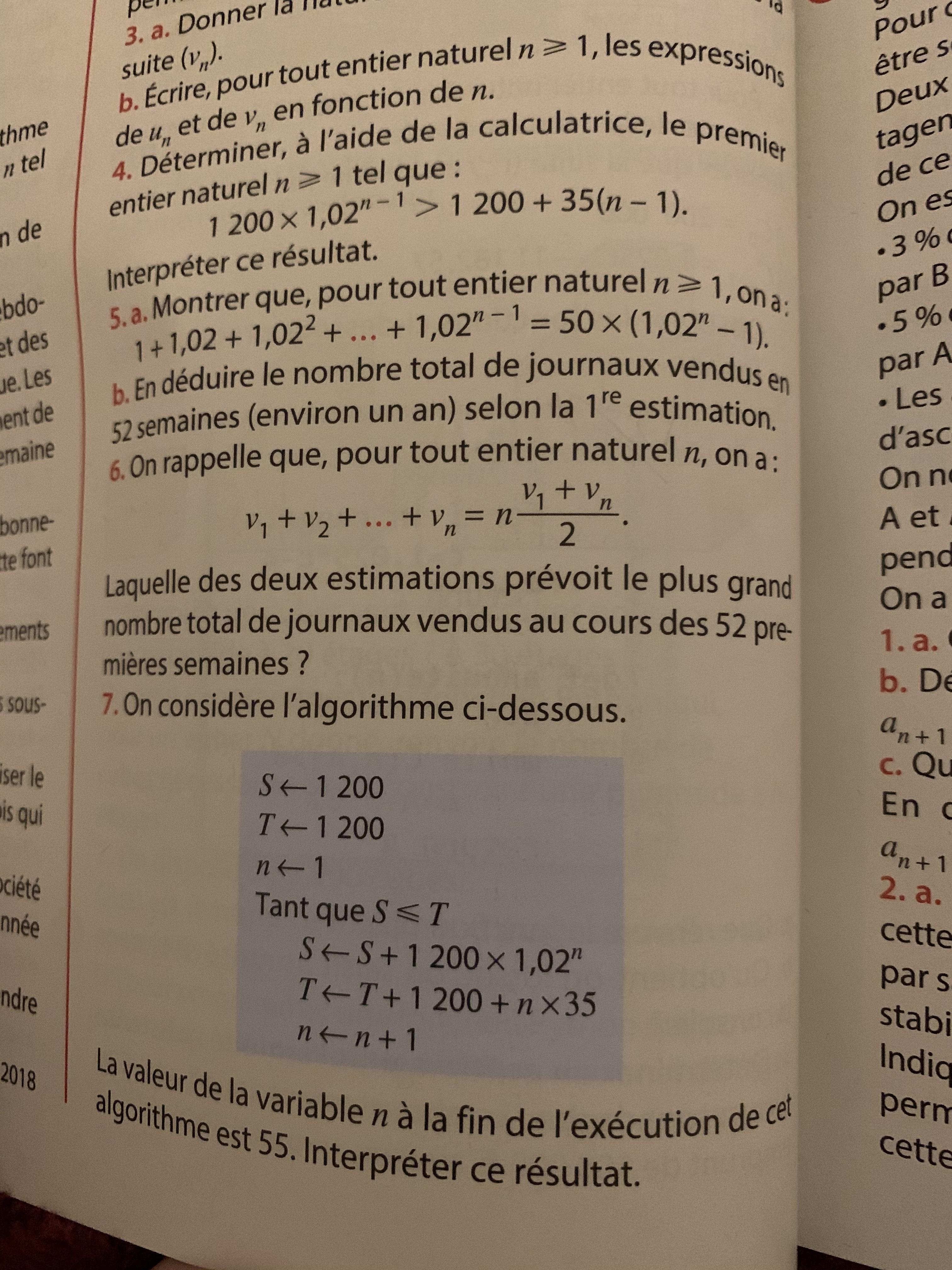 E-Bahut julesx Posté(e) le 26 novembre 2019 E-Bahut Signaler Posté(e) le 26 novembre 2019 Petite rectification : Il y a une erreur de transcription dans ton programme Python, c'est While u >0.5 :. A noter que Python retourne 57 car u(56)=0,500038... dons légèrement supérieur à 0,5. Pour la 3), comme on demande une valeur à 0,1% près, la bonne valeur est 78,1%.