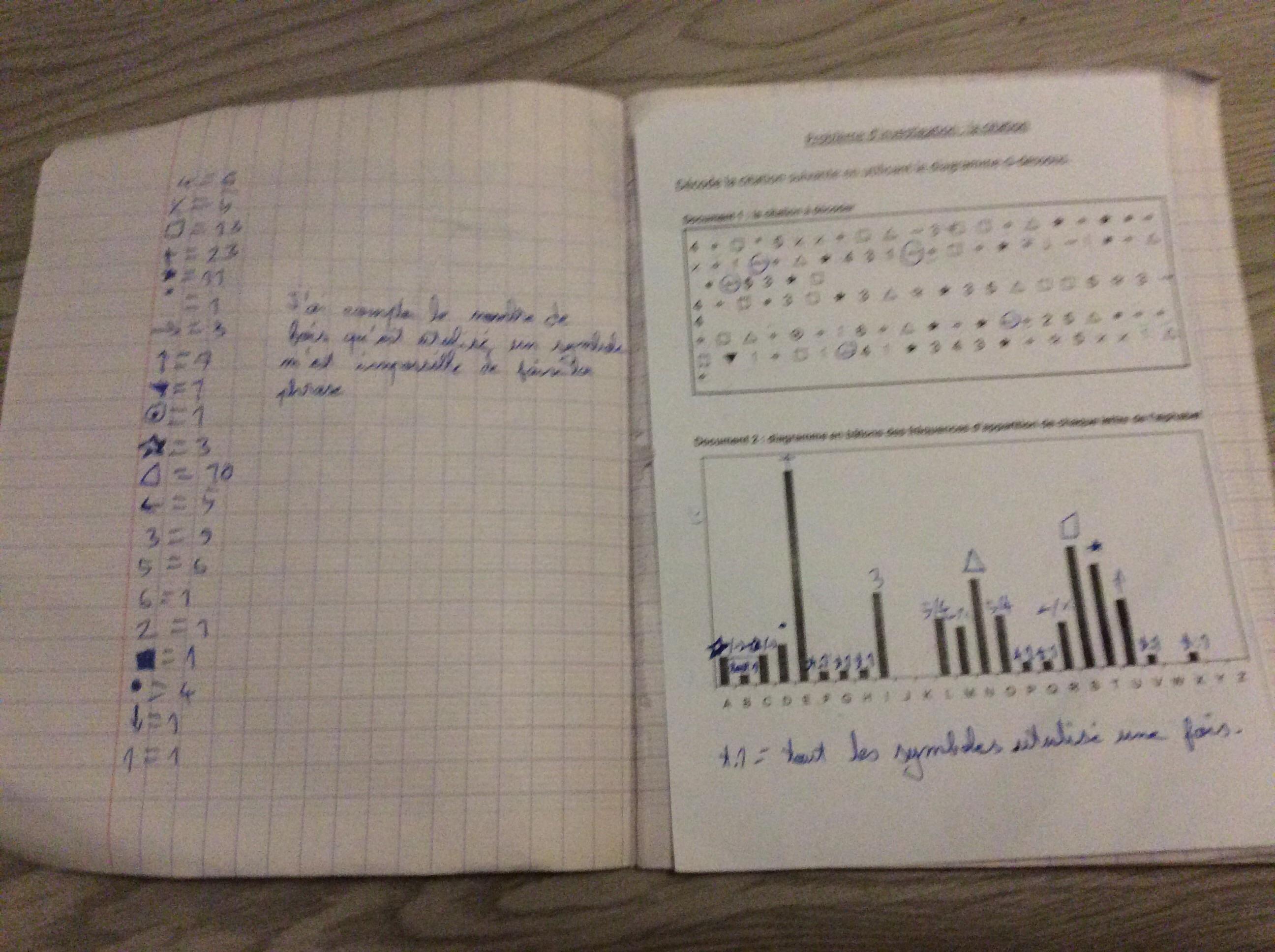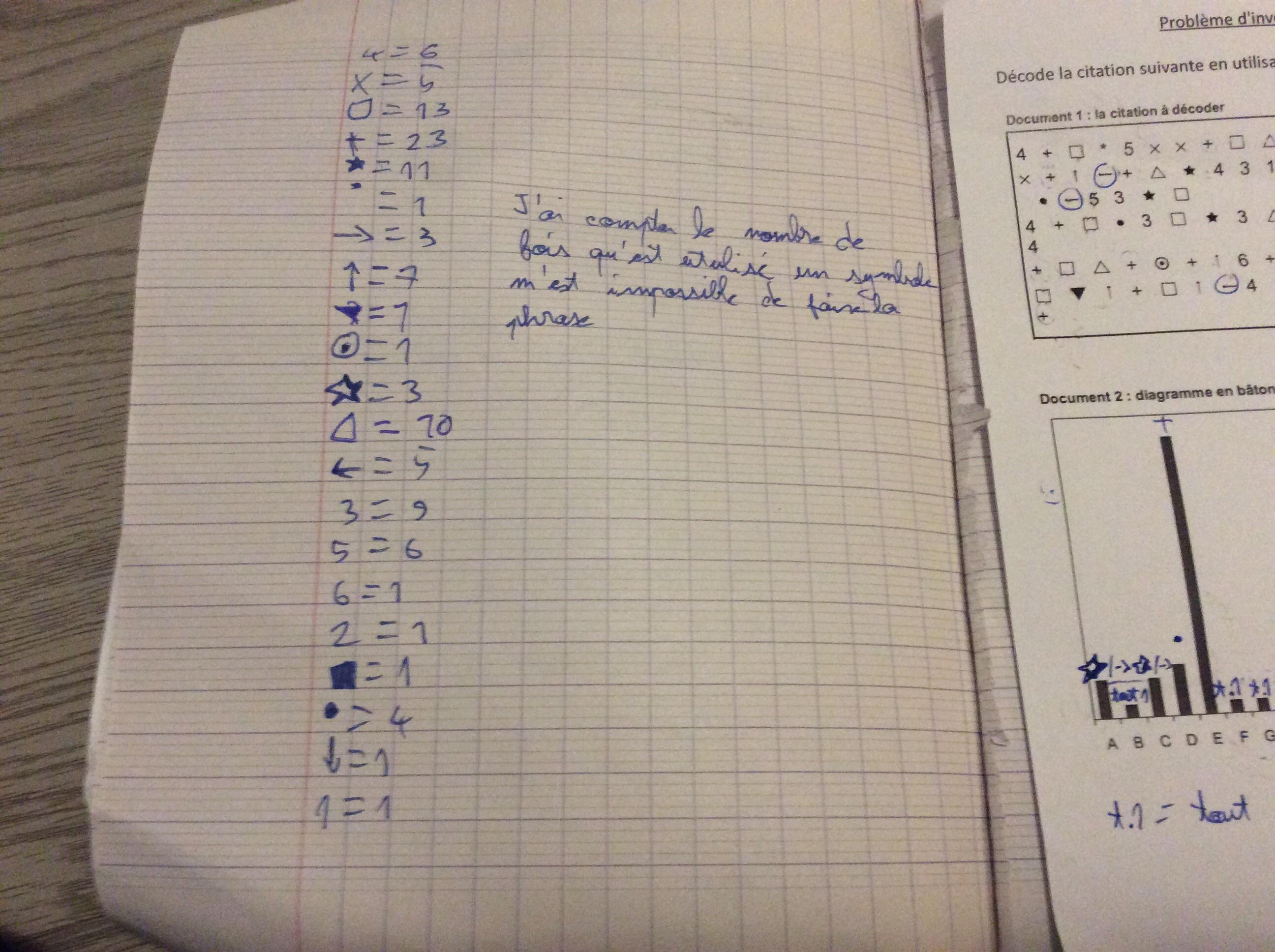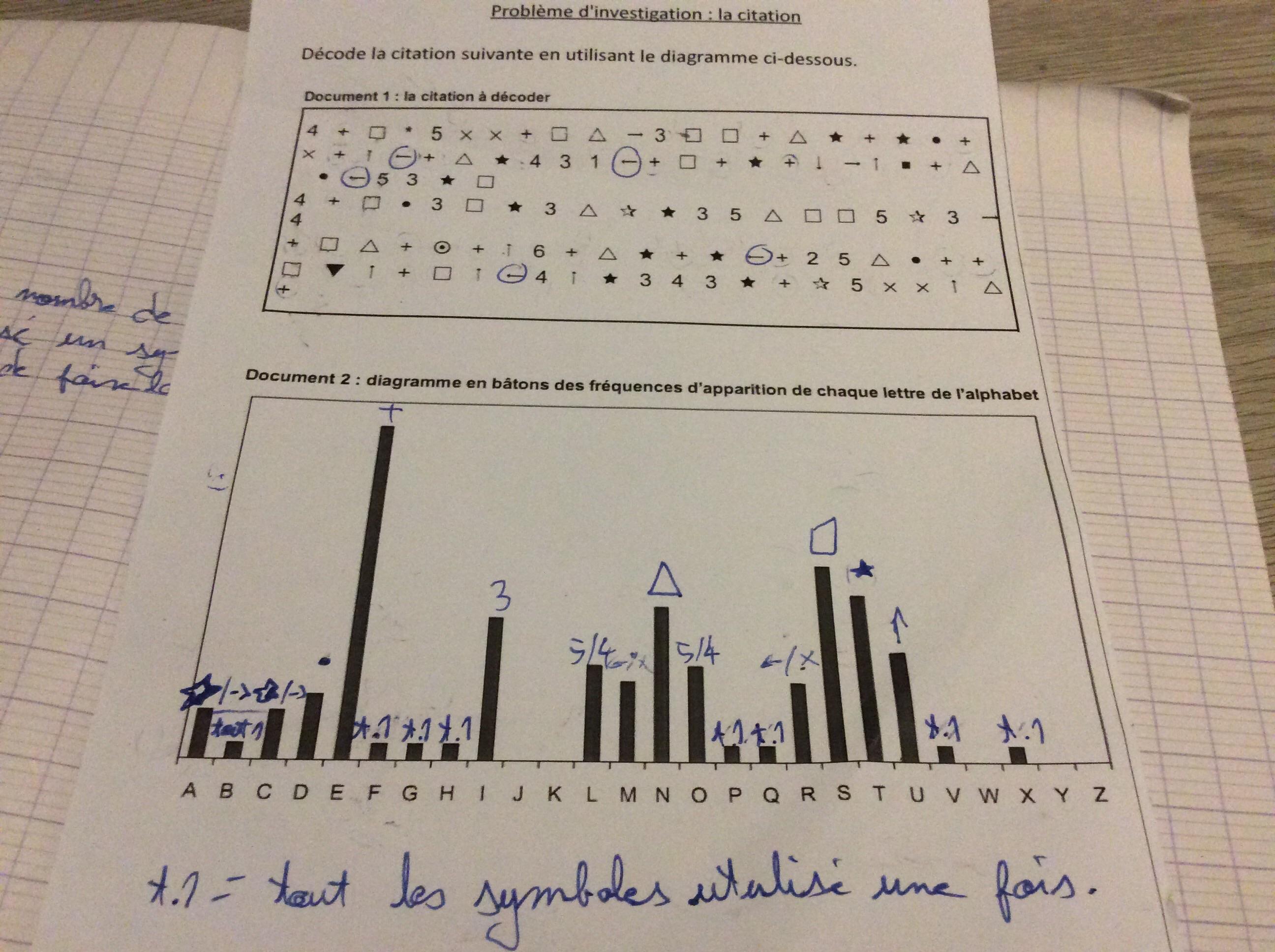 E-Bahut julesx Posté(e) le 26 novembre 2019 E-Bahut Signaler Posté(e) le 26 novembre 2019 Ce n'est pas tout à fait évident avec les documents que tu as fournis, mais j'ai réussi à en décoder une partie et je pense que la citation complète est Les hommes naissent et demeurent libres et égaux en droits Les distinctions sociales ne peuvent être fondées que sur l'utilité commune Je te laisse vérifier avec les diagrammes mis à ta disposition. De toute façon, l'idée de départ est de commencer par remplacer les signes les plus fréquents par les lettres correspondantes et d'essayer de compléter ensuite de façon à obtenir des mots cohérents avec le contexte.