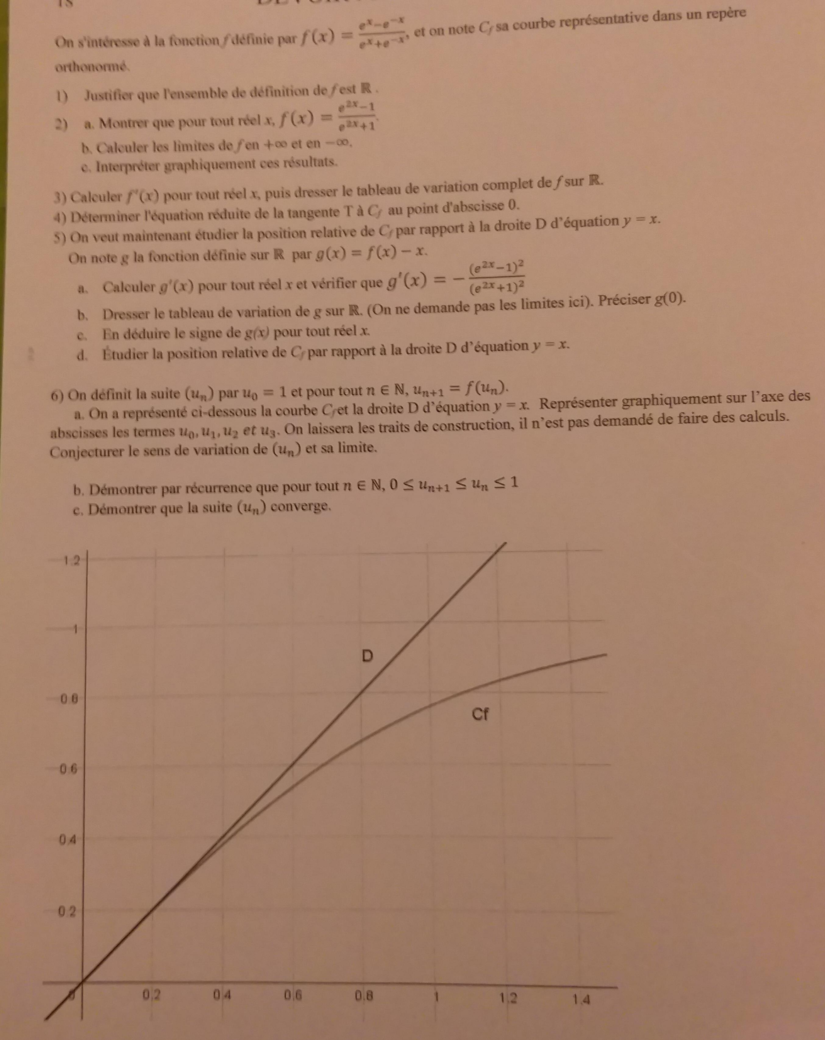 E-Bahut pzorba75 Posté(e) le 29 novembre 2019 E-Bahut Signaler Posté(e) le 29 novembre 2019 Pour les questions 1 et 2 : 1) f est définie sur R, son dénominateur n'étant jamais nul (somme de deux exponentielles) 2) en multipliant le dénominateur et le numérateur de f par e^x, jamais nul, on obtient la forme demandée. la limite en +infty de e^{2x} est +infty, donc le limite de f en +\infty est 1. la limite en -infty de e^{2x} est 0, donc le limite de f en -\infty est -1. 3) pas de difficulté 4) Appliquer la formule du cours la tangente au point d'abscisse a est donnée par y=f'(a)(x-a)+f(a), le résultat est y=x. 5) Position relative de C et T tangente : x<0 : f(x)-x>0 =>C est au-dessus de T, x>0 : f(x)-x<0 =>C est au-dessous de T À toi de rédiger en justifiant ces réponses, les calculs sont très simples et sans aucun piège. 6) Pour l'étude de la suite (un), montre d'abord ce que tu as fait.