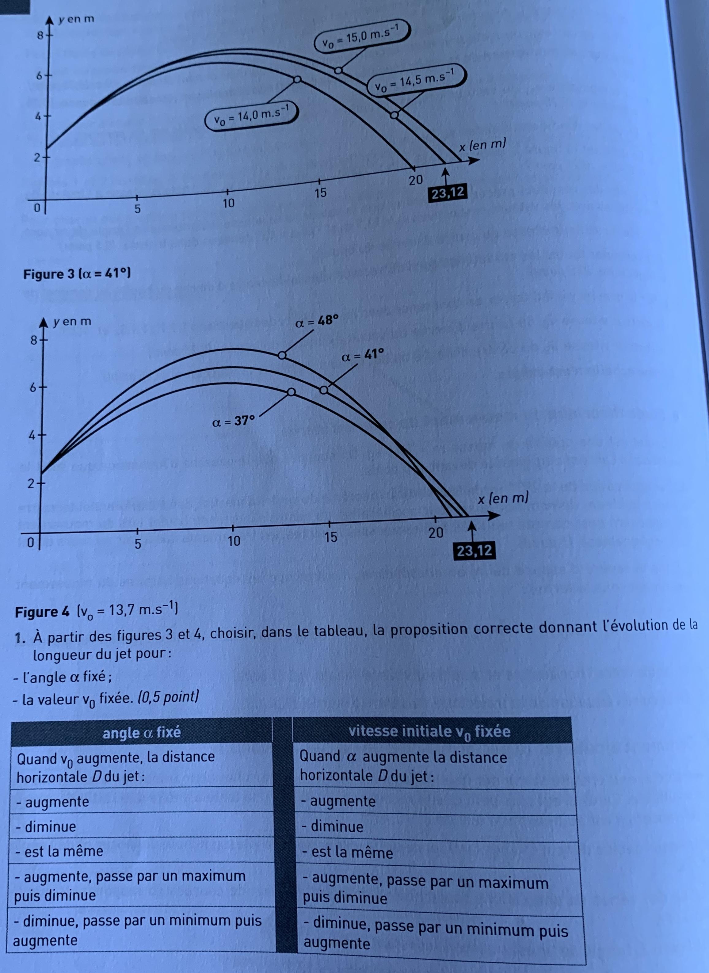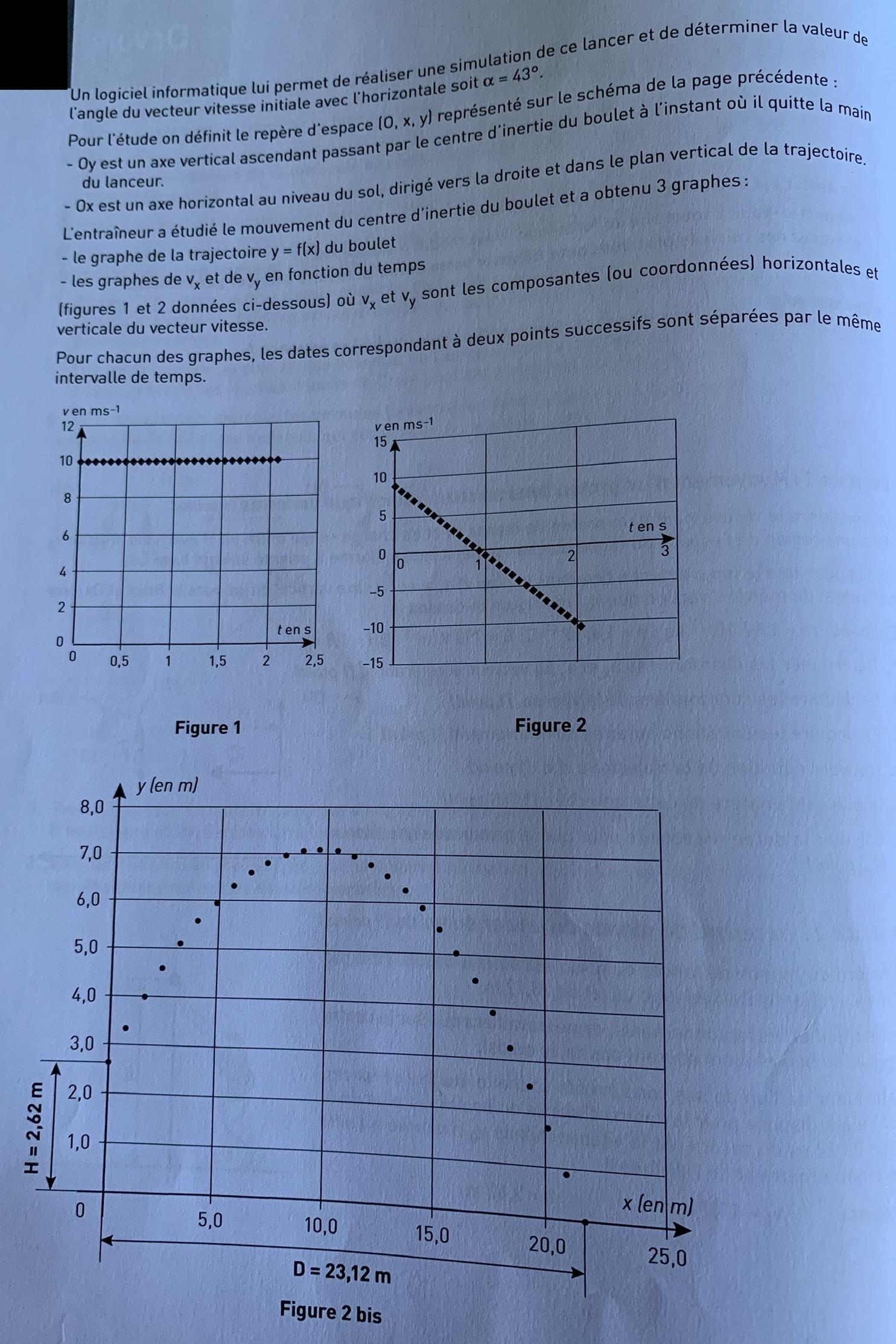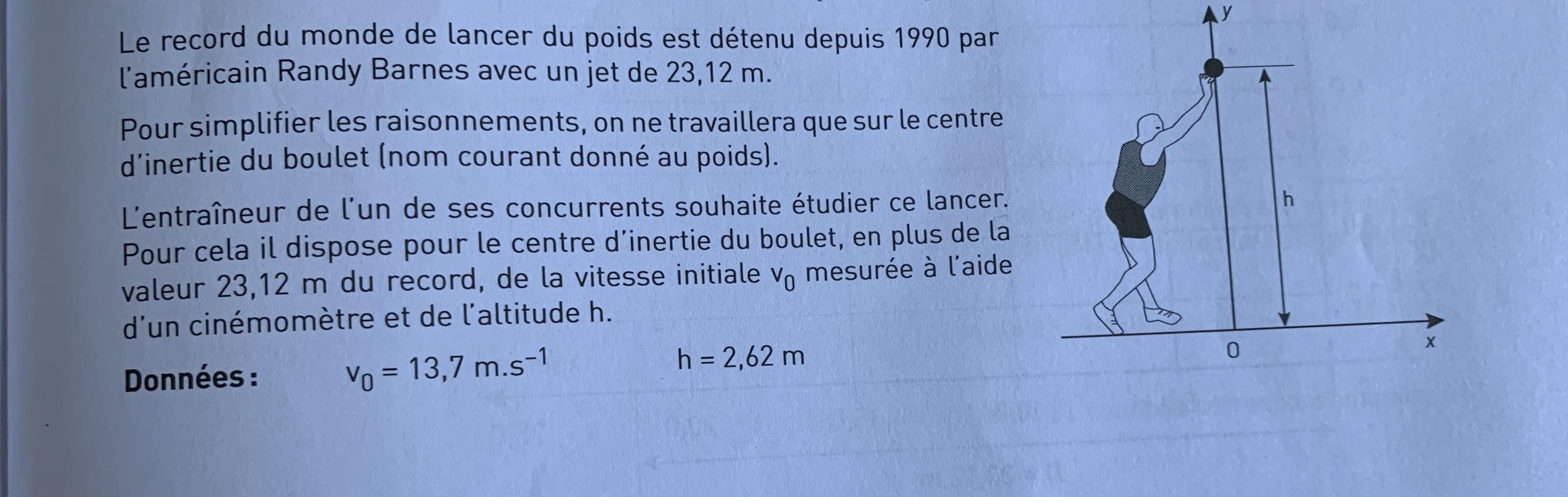 E-Bahut Barbidoux Posté(e) le 23 décembre 2019 E-Bahut Signaler Posté(e) le 23 décembre 2019 Pour débuter Lancer du poids ------------------------ A1---------- a--------- Composantes du vecteur vitesse du centre d'inertie à la date t=0 vOx=10 m/s b----------- Vitesse horizontale constante, mouvement uniforme c----------- Vsx=10 m/ s lorsque le boulet est au sommet de sa trajectoire (vy=0)