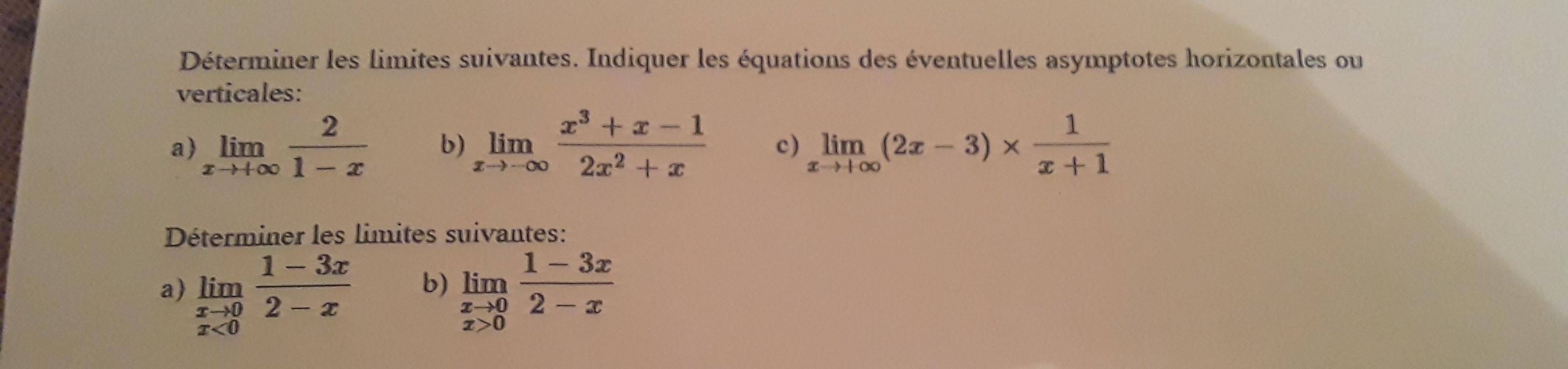 E-Bahut Barbidoux Posté(e) le 24 décembre 2019 E-Bahut Signaler Posté(e) le 24 décembre 2019 ≈ signifie « approximativement égal » ————————————— a)- lorsque x tend vers l’infini alors x>> 1 donc lim 2/(1-∞)=lim 2/(-∞)=0 ————————————— b)- lorsque x tend vers l’infini alors au numérateur x^3>> x-1 et au dénominateur 2*x^2>>x d’où lim(x^3+x-1)/(2*x^2+x)≈lim x^3/(2*x^2)=lim x=∞. Comme le rapport (x^3+x-1)/(2*x^2+x) ≈x lorsque x est très grand on en déduit que le graphe de (x^3+x-1)/(2*x^2+x) admet une asymptote oblique d’équation y=x/2. En étudiant la limite de la différence (x^3+x-1)/(2*x^2+x)- x /2=-(x^2-2*x+2)/(4*x^2+2*x) qui est négative et tend vers -1/4 on en déduit que le graphe de (x^3+x-1)/(2*x^2+x) tend vers son asymptote par valeurs inférieures ————————————— c) lorsque x-> ∞ alors 2*x-3≈2*x et x+1≈x ce qui fait que lim(2*x-3)/(x+1) ≈ lim2*x/x=2 ————————————— a)- lorsque x-> 0- alors 1-3*x=1-3*0-≈1 et 2-x=2-0-≈2 ce qui fait que lim(1-3*x)/(2-x) =1/2 ————————————— b)- même raisonnement et même limite