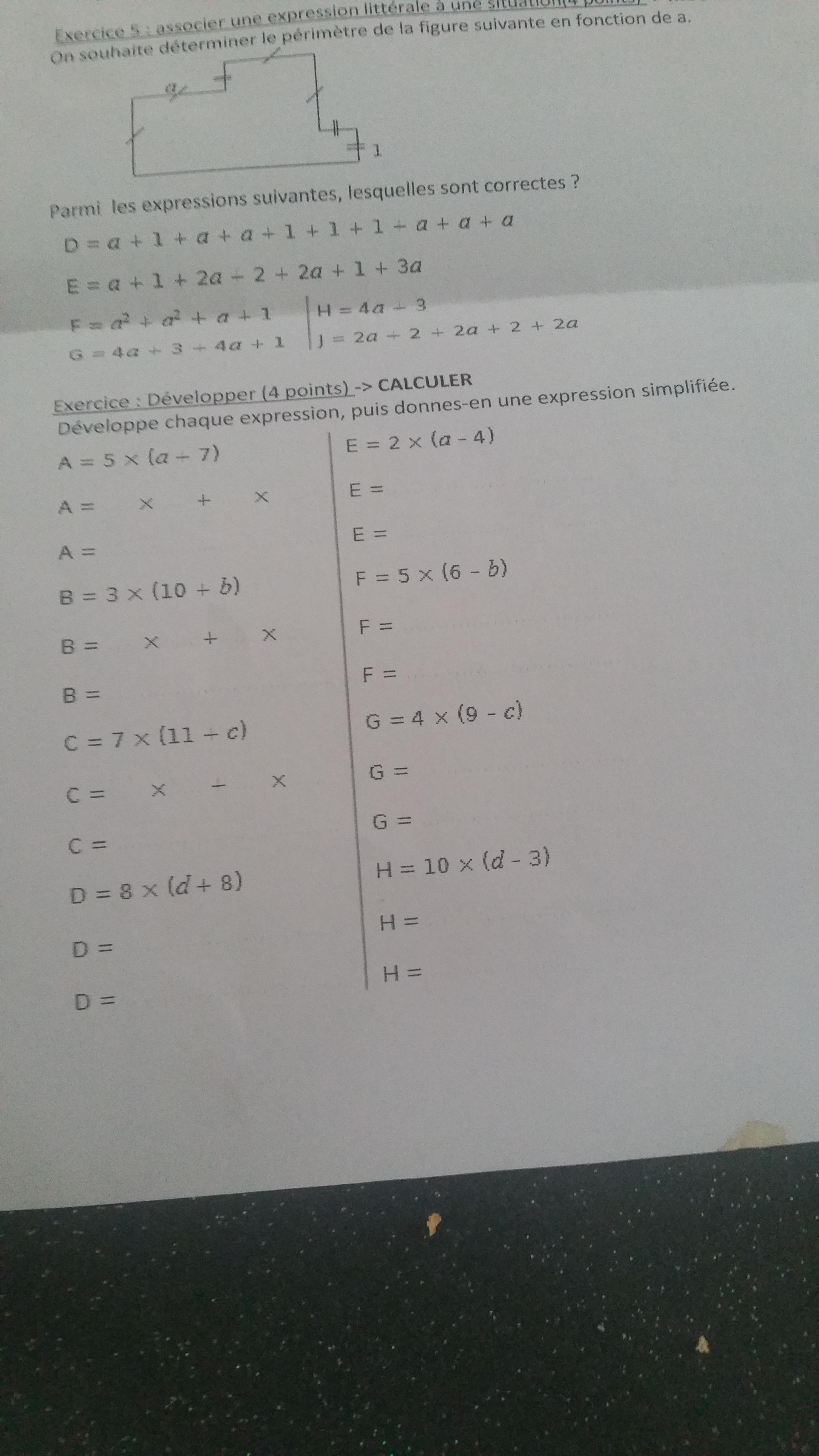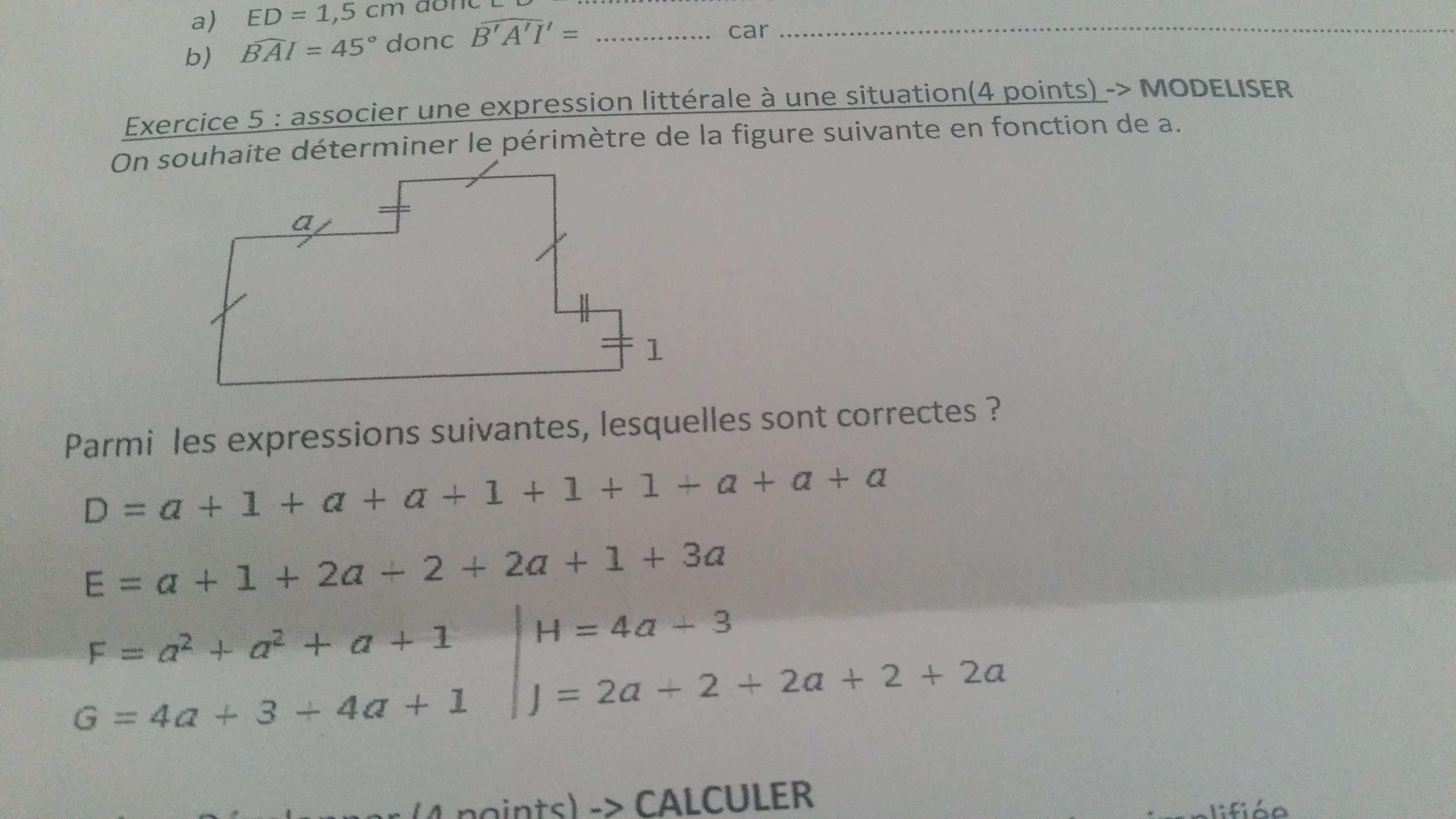 E-Bahut PAVE Posté(e) le 7 janvier 2020 E-Bahut Signaler Posté(e) le 7 janvier 2020 Si je "réduis l'expression G, j'obtiens : G = 4a+4a+3+1 = 8a +4 Or si tu avais cherché l'expression du périmètre comme je te l'avais suggéré :* Citation périmètre = AB +BC+CD+DE+EF +FG+GH+HK+KL +LA certains des segments mesurent 1 unité et les autres un nombre inconnu appelé a (unités). Ainsi si on remplace par les mesures: périmètre = a+1+a+a+1+1+1+a+a+a qui quand on "réduit" donne : périmètre = 6a+4 Tu aurais vu tout de suite que G (8a+4) n'est pas l'expression du périmètre (6a+4) !! Essaye pour voir si tu as compris de réduire J J = ????