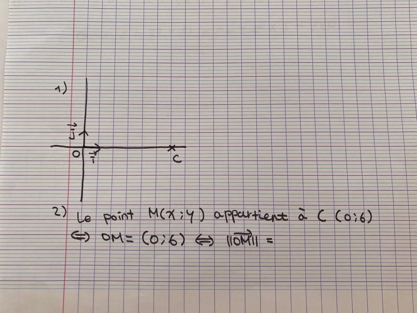 E-Bahut Barbidoux Posté(e) le 5 janvier 2020 E-Bahut Signaler Posté(e) le 5 janvier 2020 2a)—————————— OM=6 <==> ||vect(OM)||=6 <==> ||vect(OM)||^2=36 2b)—————————— Pythagore ||vect(OM)||^2=36=x^2+y^2 3——————————— coquille dans l’énoncé les point A et C appartenant au cercle C satisfont son équation. De l’égalité yC=YyA=0 ==> x^2=36 ==> xA=6 et xC=-6 puisque xC<xA A et C sont les extrémité d’un diamètre du cercle C