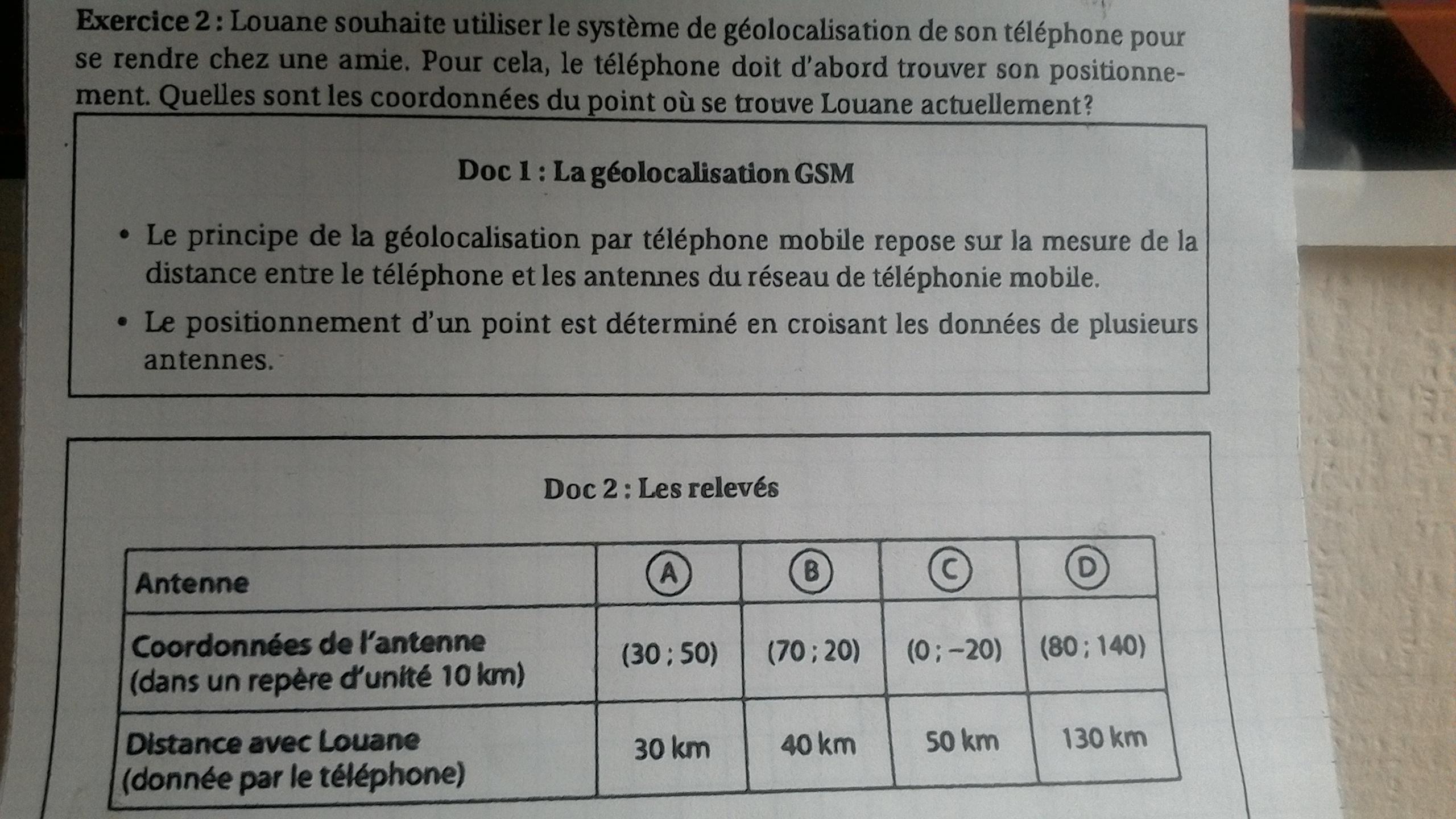E-Bahut PAVE Posté(e) le 5 janvier 2020 E-Bahut Signaler Posté(e) le 5 janvier 2020 Citation Désoleré je ne comprends pas Alors voilà la réponse : si le mobile indique que Louane est à 30 km de l'antenne A, c'est que Louane est quelque part sur un cercle centré sur l'antenne A et de rayon 30 km (donc sur ton plan quelque part sur le cercle centré en A et de rayon 3 cm !!). Comprends tu cela ?