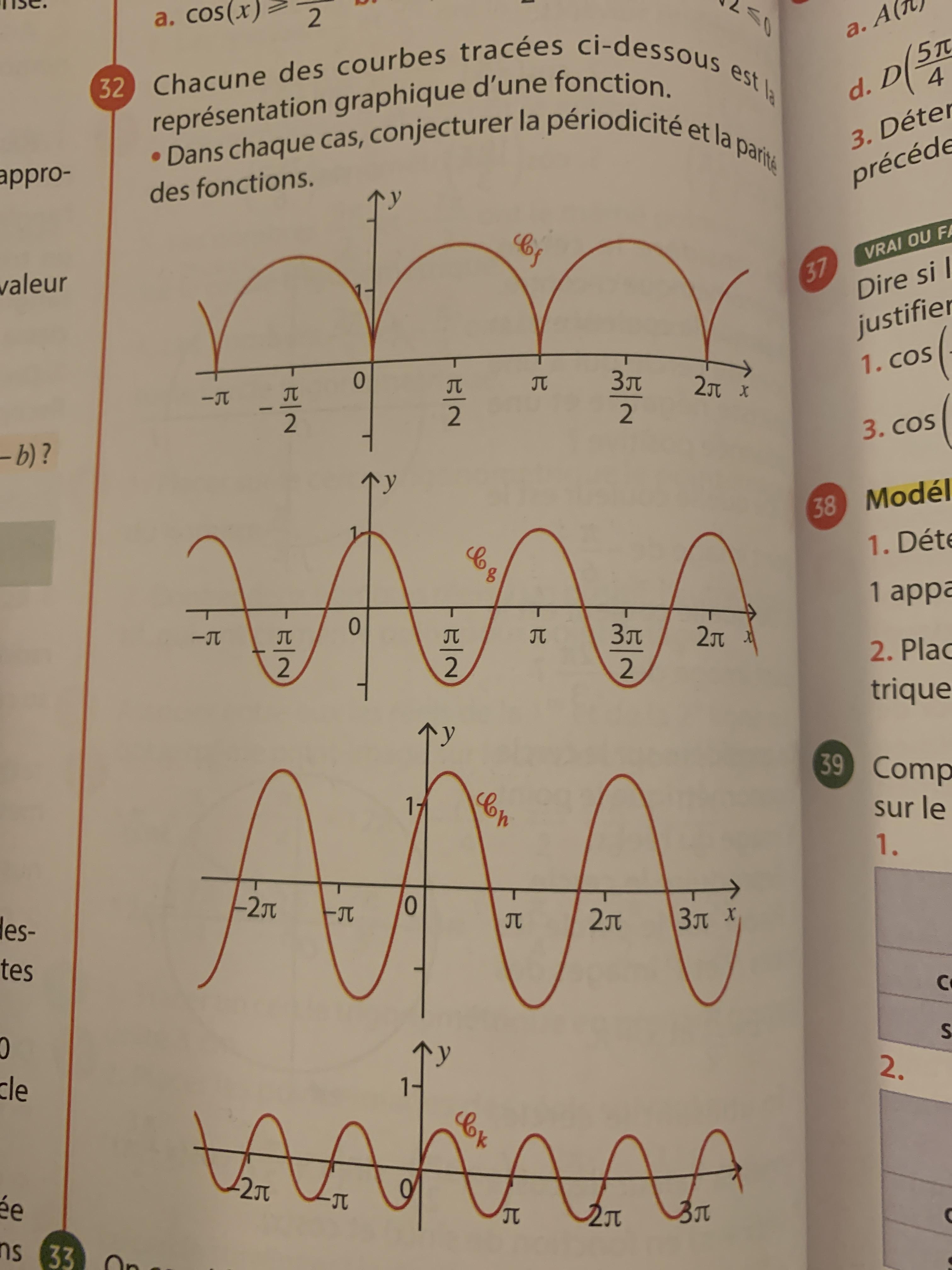 anylor Posté(e) le 8 janvier 2020 Signaler Posté(e) le 8 janvier 2020 bonjour exercice 32 une fonction paire se définit par : f(x) = f(-x) à voir sur ton cours et graphiquement sa courbe doit être symétrique par rapport à l'axe des ordonnées. et pour la période, c'est lorsque la courbe se reproduit de façon identique sur des intervalles identiques. ( à voir sur ton cours ) pour la fonction 1) conjecture la courbe de la fonction semble symétrique par rapport à (O,y) donc paire et de période pi je te laisse continuer. pour l'exercice 34 il faut que tu démontres que sin(2x)+cos(x)*sin(x) = sin(2(x+pi))+cos(x+pi)*sin(x+pi)