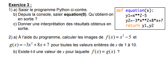 E-Bahut julesx Posté(e) le 11 janvier 2020 E-Bahut Signaler Posté(e) le 11 janvier 2020 Pour la question 2 de l'exercice 3, soit tu entres successivement equation(1), equation(2), ... jusqu'à equation(10) soit tu crées une boucle for i in range(1,11): print(i,equation(i)) N.B.: Personnellement, je suis toujours obligé de rajouter un print devant equation(), mais j'ai peut-être raté un épisode... Quelle que soit la méthode choisie, tu trouveras une valeur de i pour laquelle y1=y2. Tu peux ensuite la justifier en résolvant l'équation f(x)=g(x).