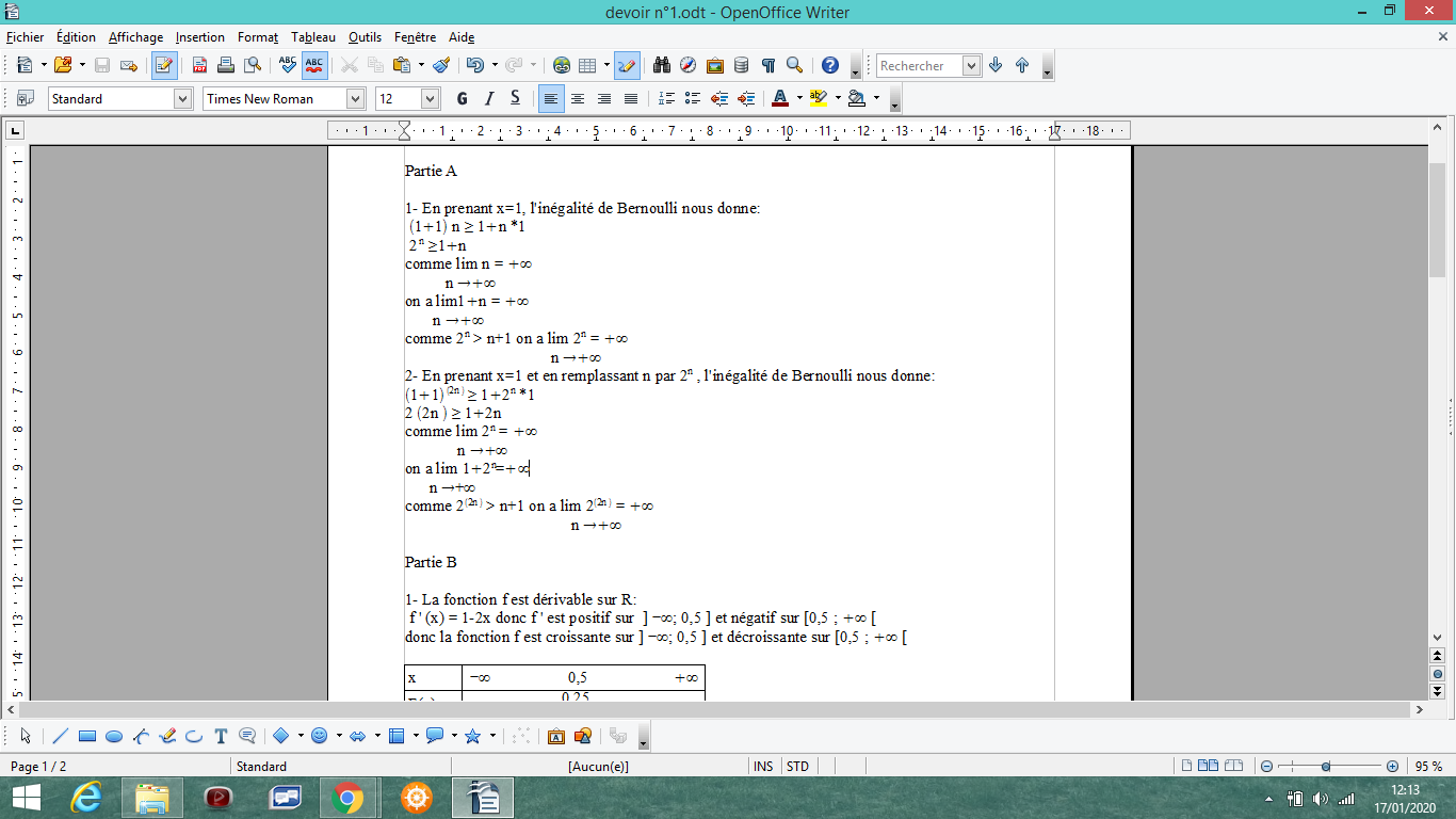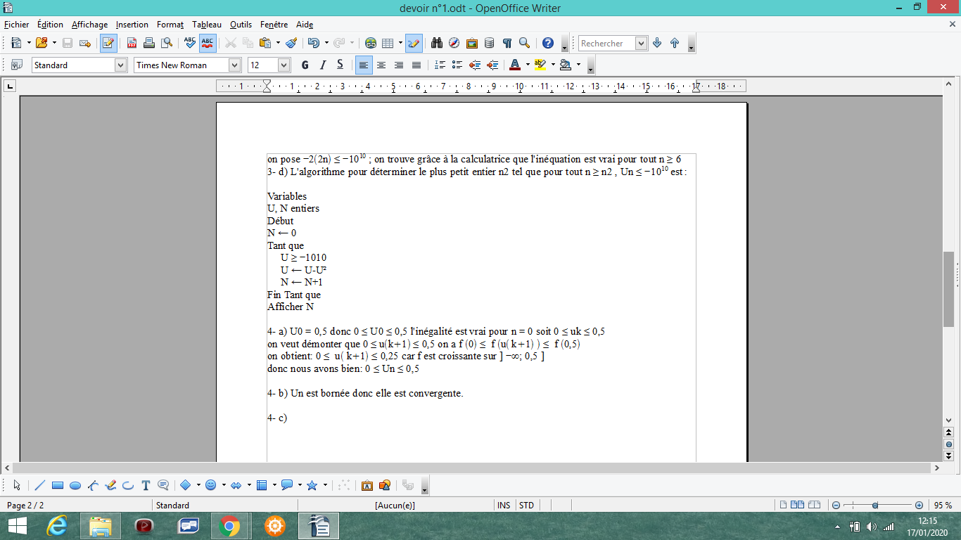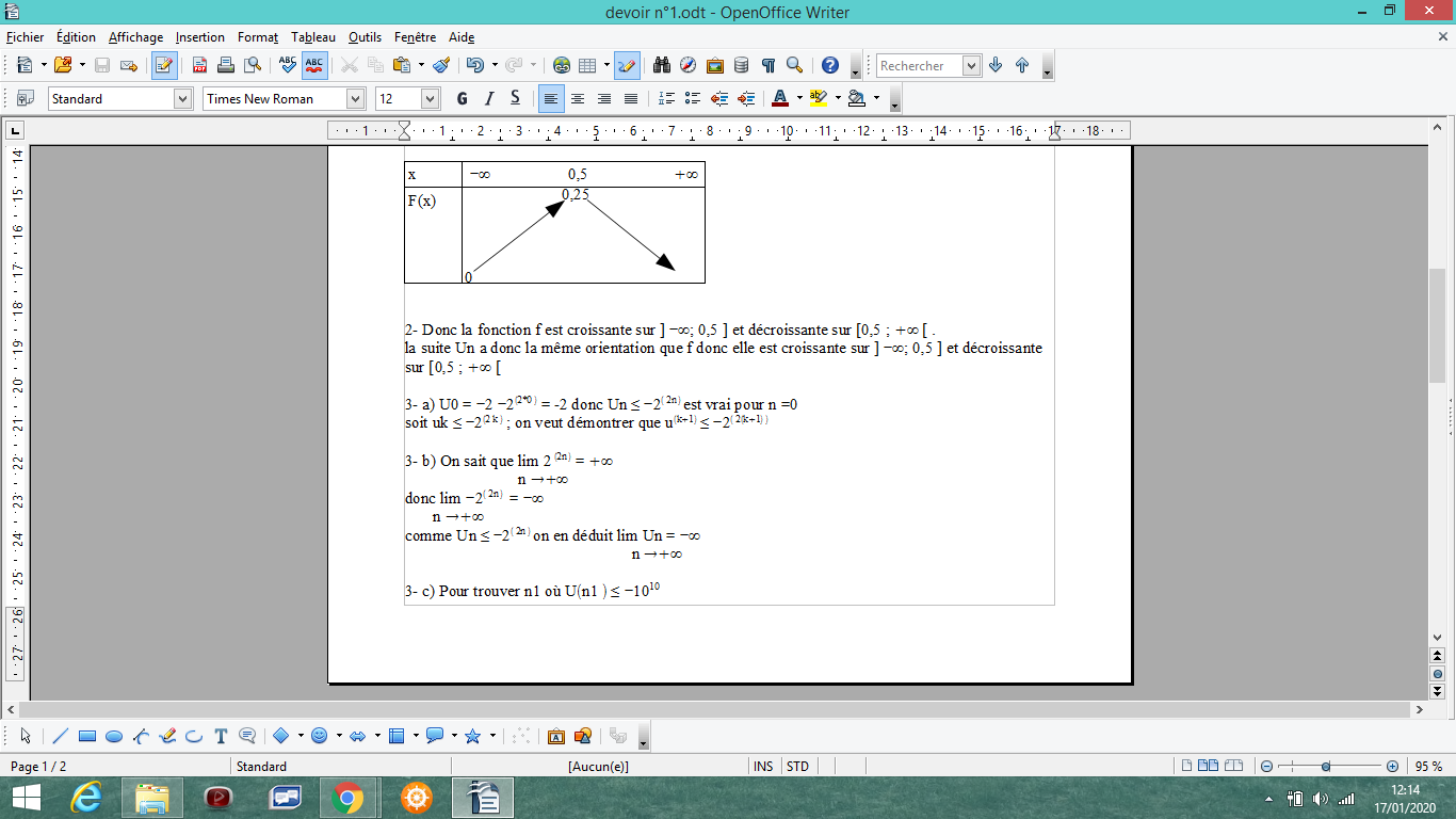 didine8413 Posté(e) le 17 janvier 2020 Signaler Posté(e) le 17 janvier 2020 Bonjour J'aurai besoin d'un avis sur mon travail et d'aide sur les questions 3-a) et 4-c) svp Le sujet : PARTIE A On prendra comme prérequis lim n =+∞, n→+∞ les règles opératoires sur les limites et les théorèmes decomparaisons à l’infini. On rappelle l’inégalité de Bernoulli : pour tout x > 0 et tout n de N, (1+x )n ≥1+nx . 1) À l’aide de l’inégalité de Bernoulli, montrer que: lim 2n =+∞ n→+∞ 2) En déduire que lim 2(2^n ) =+∞ n→+∞ Partie B Soit (un ) la suite définie par son premier terme u0 et par la relation de récurrence : un +1 =f (un ) où f est définie sur R par : f (x )= x −x² . 1)Dresser le tableau de variations de f sur R. 2) Déterminer le sens de variation de la suite (un ). 3) Cas : u0 = −2. a) Montrer, par récurrence que pour tout n de N,un ≤−2( 2^n) . (*) b) En déduire lim un . n →+∞ c) À l’aide de l’inégalité (*), trouver un rang n1 tel que pour tout n ≥ n1, un ≤ − 10 10 . d) Dans cette question, toute trace de recherche même non fructueuse sera prise en compte dans l’évaluation. À l’aide d’un algorithme que l’on détaillera sur la copie et qu’on implémentera sur la calculatrice, déterminer le plus petit entier n2 tel que pour tout n ≥ n2, un ≤ − 1010 . 4) Cas : u0 = 0,5. a) Montrer que pour tout n de N, 0 ≤un ≤ 0,5. b) En déduire que (un ) converge. c) Montrer que pour tout n de N, un ≤1/n. En déduire lim un Mon travail :