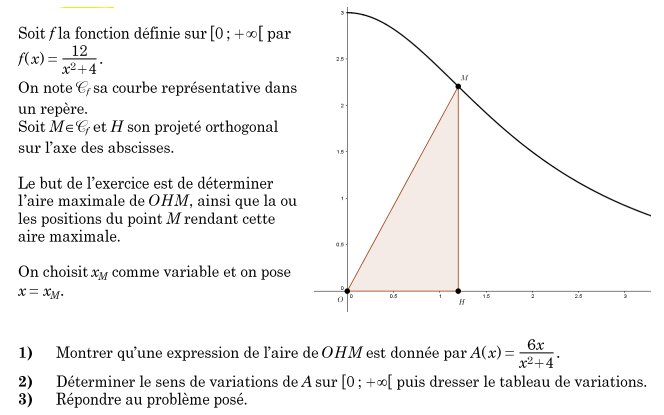 E-Bahut Barbidoux Posté(e) le 23 janvier 2020 E-Bahut Signaler Posté(e) le 23 janvier 2020 Aire de OMH= HM*OH/2=6*x/(x^2+4) A’(x)=6/(x^2+4)-6*x(2*x)/(x^2+4)^2=(6*x^2+24-12*x^2)/(x^2+4)^2=(-6*(x^2-4)/(x^2+4)^2 le signe de Ax est celui de -(x+2)*(x-2) qui est du signe du coefficient de x^2 à l’extérieur de ses racines x………0………………………………(+2)……………………… A’x)…………….……(+)………………(0)……….(-)……………. A(x)……… ……….crois…………….Max…….decrois………….. avec max =f(2)=3/4