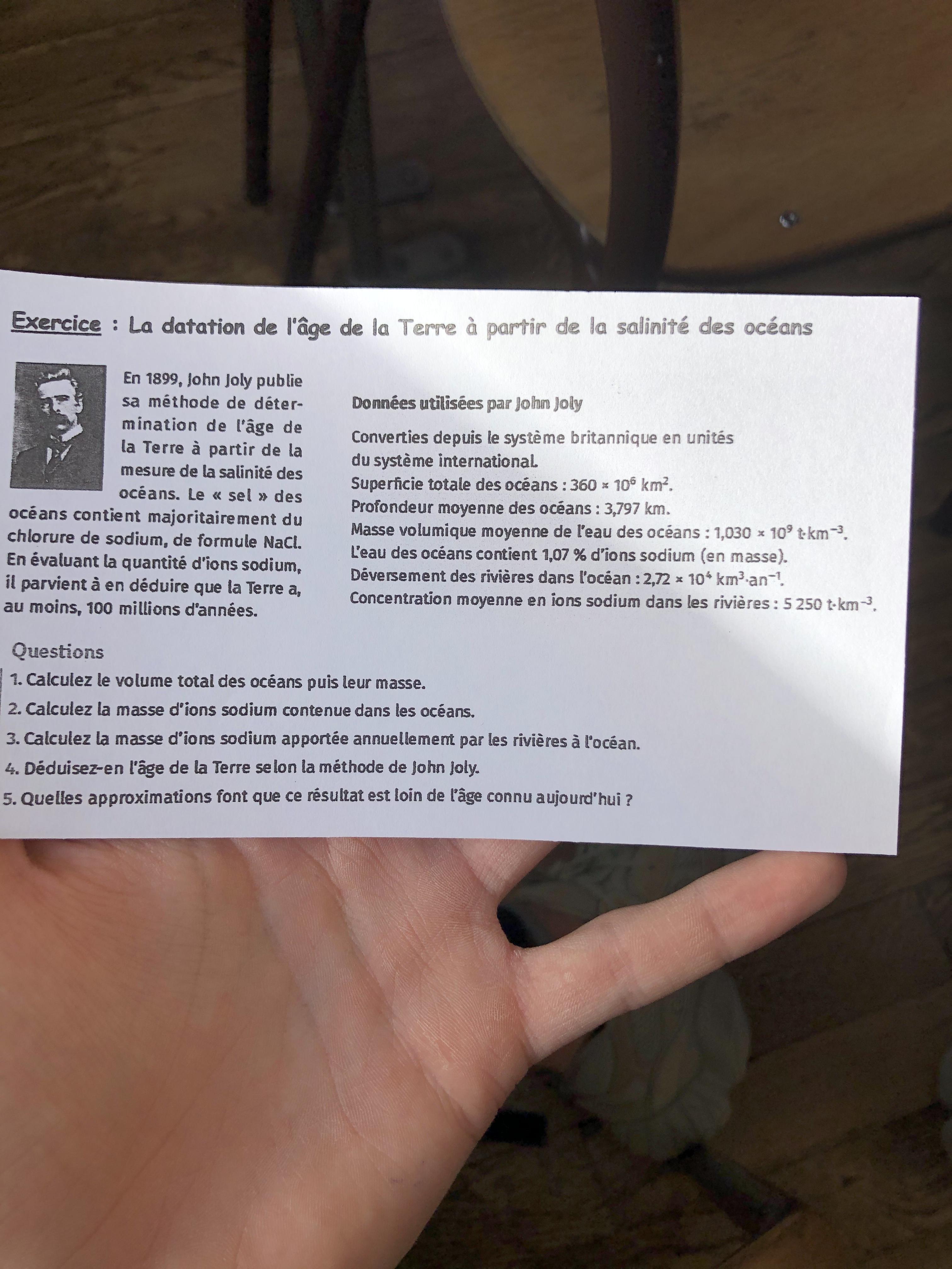 E-Bahut Barbidoux Posté(e) le 10 février 2020 E-Bahut Signaler Posté(e) le 10 février 2020 voir là http://acces.ens-lyon.fr/acces/thematiques/limites/Temps/allee/enseigner/le-calcul-de-john-joly volume des océans =S*Profondeur=360*10^(6)*3.797=1.367*10^(9) km^3 masse des océans =V*rho=1.367*10^(9)*1.030*10^(9)=1.41*10^(18) t masse d'ion sodium=1.41*10^(18) 0.0107=1.51*10^(16) t
