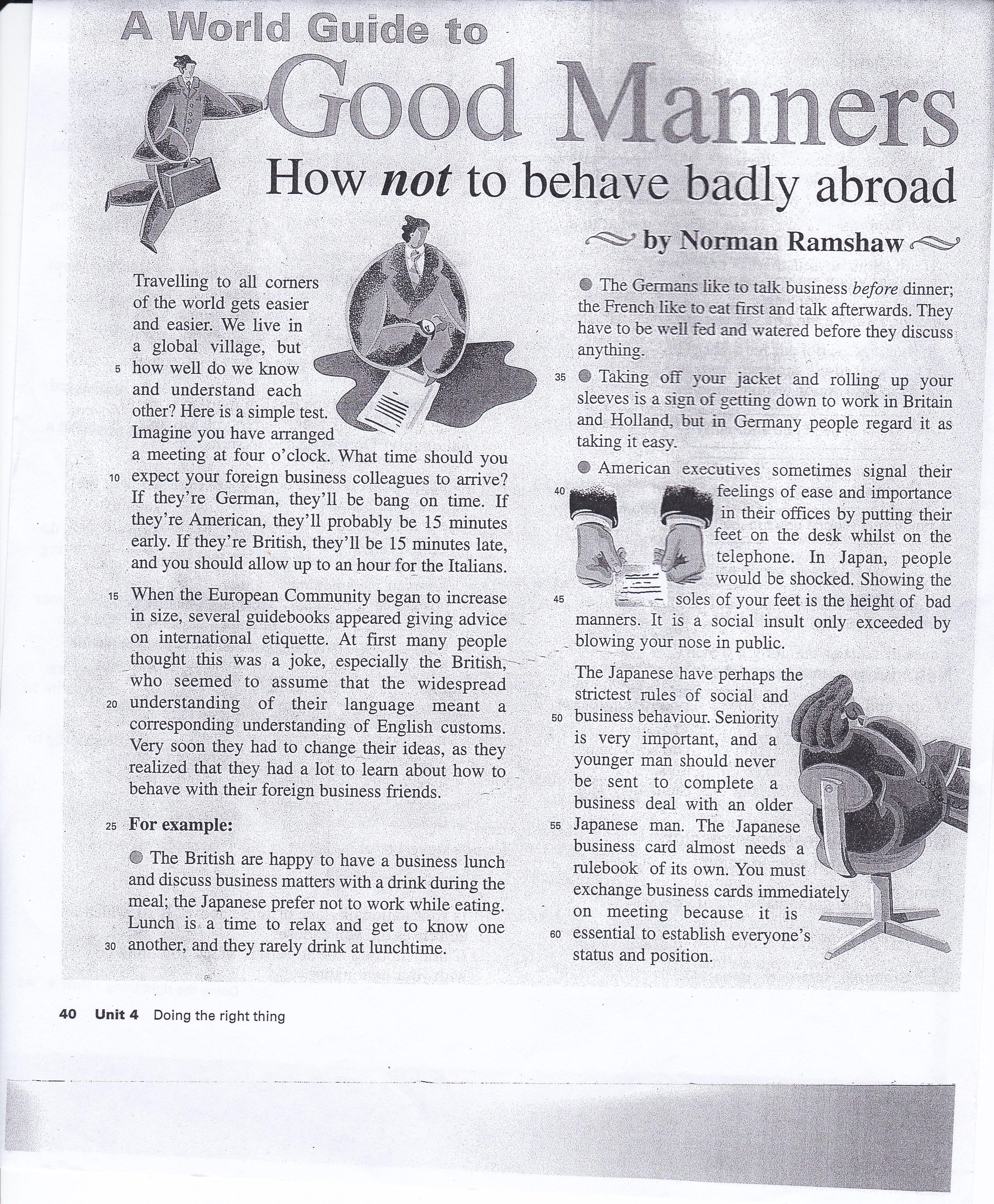 Tau Posté(e) le 7 mars 2020 Signaler Posté(e) le 7 mars 2020 Hello, I have a comprehension work to do about good manners. Some questions first and a subject to discuss. Could you please correct it ? Citation I – COMPREHENSION CHECK 1/ The Germans and the Americans are the most punctual people while the least punctual are the British and the Italians. 2/ The British assume that the widespread understanding of their language means a corresponding understanding of their customs. 3/ The Germans and the French don’t like to eat and do business at the same time. 4/ Normally, you have to feed and water animals. 5/ The people on the pictures are Japanese beacause one of them has his head bowed, which is the way they greet. 6/ First, he shouldn’t complete a business deal with an older Japanese man or put his feet on the desk. Then, he should exchange business cards immediately on meeting and bow to greet someone. 7/ In England : « - Hello! The weather is splendid, isn’t it? » « - Hello! Yes, indeed! » In America : « - Hi! Where are you from ? » « - Hi! I’m from Boston, Massachussets!» « - Oh! What a coincidence, I was born in Boston! » 8/ In the Middle East, you must use the right hand for greeting, eating, drinking or smoking. In Thailand, you should clasp your hands together when you greet someone. In America, you should eat you hamburger with both hands. 9/ It’s not a good idea to say that you absolutely love your Egyptian friend’s vase because he would feel that he has to give it to you. It’s not a good idea to go to Russia if you don’t drink alcohol because you must match your hosts drink for drink or they will think you are unfriendly. It’s not a good idea to say « Hi! See you later! » when you’re introduced to someone in Afghanistan because you should spend at least five minutes saying hello. It’s not a good idea to discuss politics with your American friend in a McDonald’s because you should eat your hamburger as quickly as possible and shouldn’t try to have a conversation until it’s eaten. II – DISCUSSION What are the 'rules' about greeting people in your country? When do you shake hands? When do you kiss? What about when you say goodbye? In France, there aren’t strict rules about greeting people. Everyone does as they please although there are some conventional ways to greet. Most of the time, if you are a man, you should shake men’s hands and do what french people call la bise to women. It is a kind of kiss consisting of a light grazing of the cheeks and may have regional variations. As a man, in informal situations, you can do la bise to your male friends as well. In formal situations, you should shake women’s hands, especially if they have a higher social status. Either way, if someone comes towards you to do la bise to you or to shake your hands, you must do the same, otherwise they might think you are not polite. Usually, you say goodbye in the same way you greeted. If you shook hands or did la bise as greetings, then you should do it again. Thanks ! Good_Manners.2.pdf