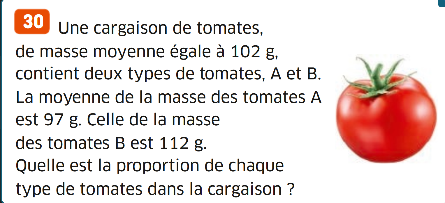 E-Bahut pzorba75 Posté(e) le 12 mars 2020 E-Bahut Signaler Posté(e) le 12 mars 2020 Pour le 30) Pose x le nombre de tomates A de masse moyenne 97 g et y le nombre de tomates B de masse moyenne 112 g, calcule la masse totale , puis la masse moyenne égale à 102 g. Et en arrangeant un peu les calculs, tu pourras conclure en donnant x/y ou y/x. Au travail.
