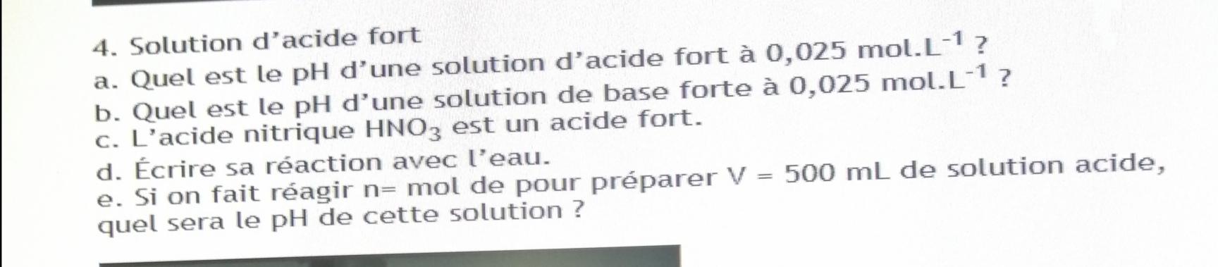 E-Bahut Barbidoux Posté(e) le 16 mars 2020 E-Bahut Signaler Posté(e) le 16 mars 2020 4a——————— pH=-lg{H3O^(+}=-lg(0.025)=1.60 4b——————— pH=14+lg{OH^(-)}=14+lg(0.025)=12.40 4c/d——————— HNO3(aq)+H2O(L)=H3O^(+)(aq)+NO3^(-)(aq) 4d——————— pH=-lg{H3O^(+}=-lg(n/V)=-lg{2*n}