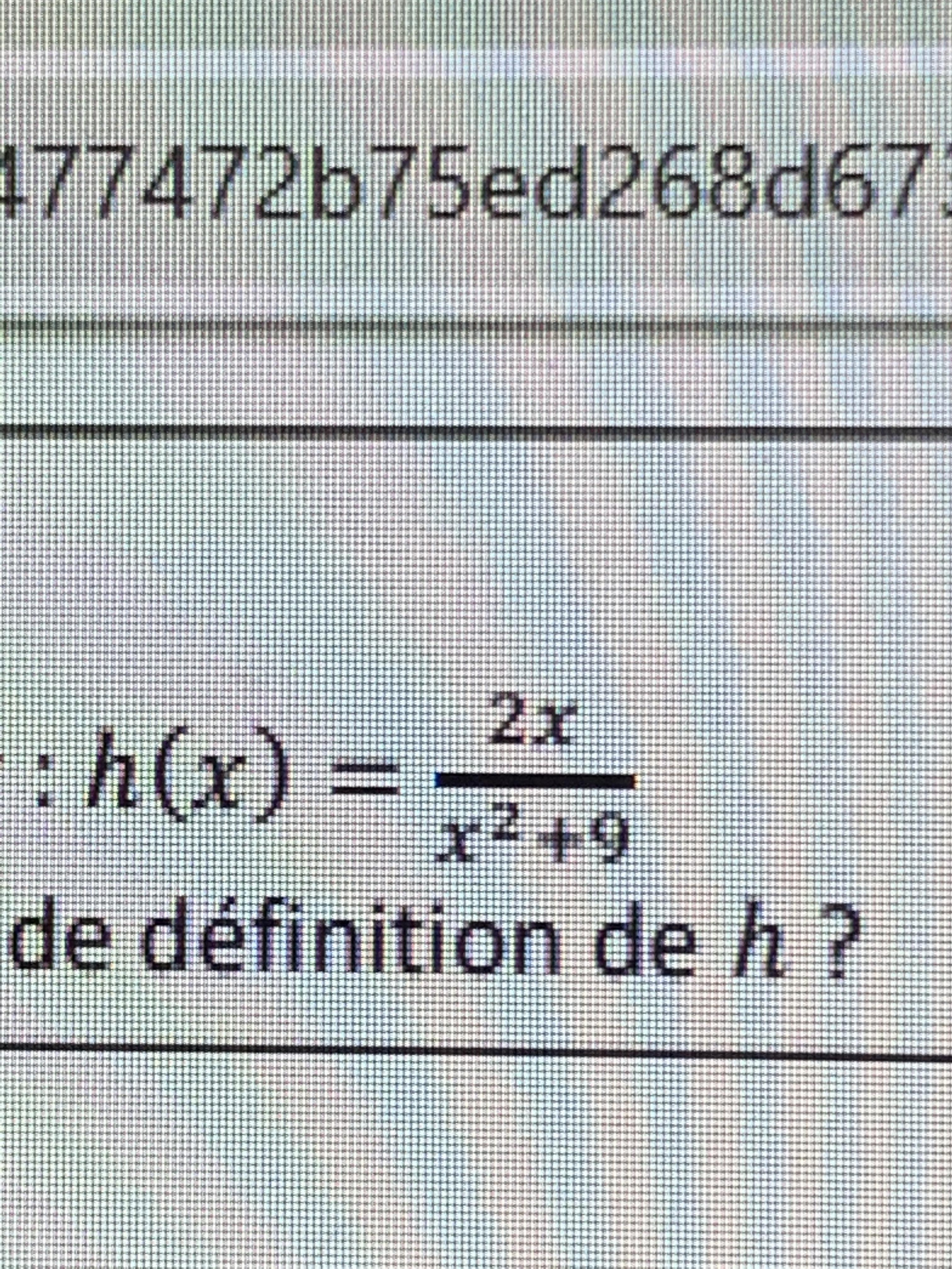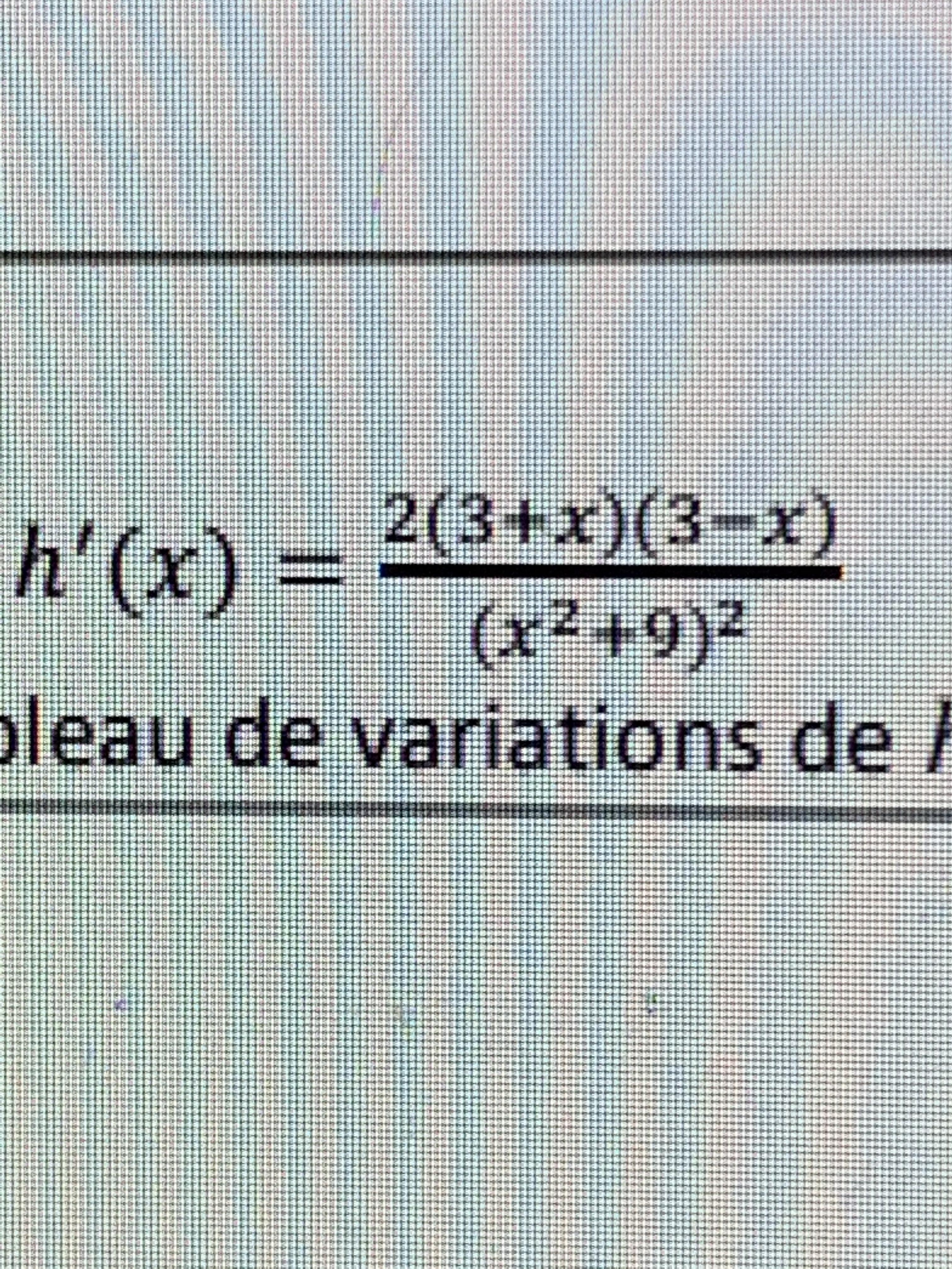 E-Bahut Barbidoux Posté(e) le 17 mars 2020 E-Bahut Signaler Posté(e) le 17 mars 2020 h(x)=2*x/(x^2+9) ==> h'(x)=2/(x^2+9)-2*x*(2*x)/(x^2-9)^2=(2*(x^2+9)-4*x^2)/(x^2+9)^2=(18-2*x^2)/(x^2+98)^2=2*(9-x^2)/(x^2+9)^2=2*(3-x)*(3+x))/(x^2+9)^2