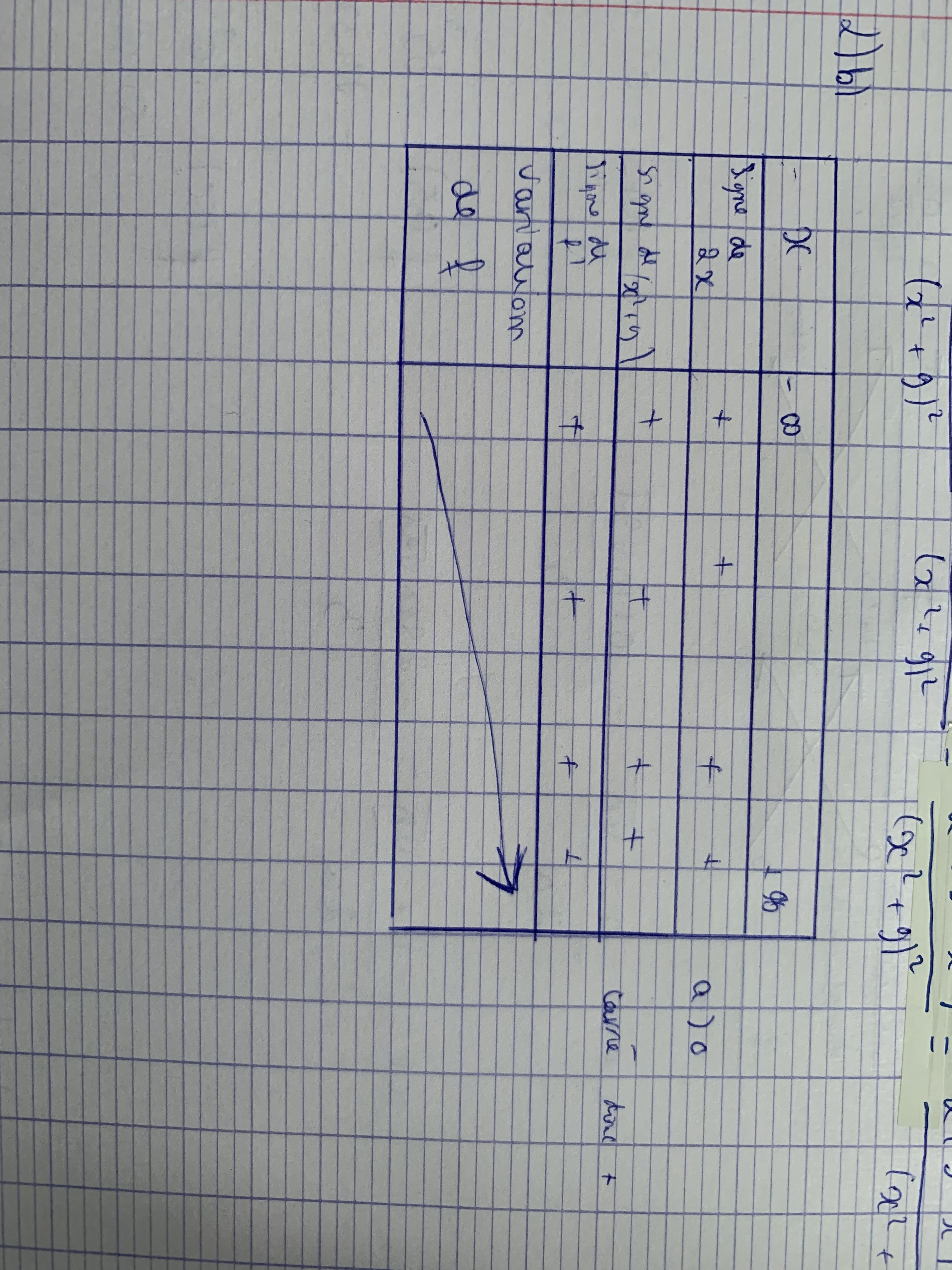Nxmrtnzzzz Posté(e) le 17 mars 2020 Auteur Signaler Posté(e) le 17 mars 2020 il y a 4 minutes, Barbidoux a dit : h(x)=2*x/(x^2+9) ==> h'(x)=2/(x^2+9)-2*x*(2*x)/(x^2-9)^2=(2*(x^2+9)-4*x^2)/(x^2+9)^2=(18-2*x^2)/(x^2+98)^2=2*(9-x^2)/(x^2+9)^2=2*(3-x)*(3+x))/(x^2+9)^2 Merci beaucoup mon tableau de variation est t il juste ?